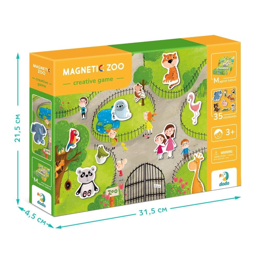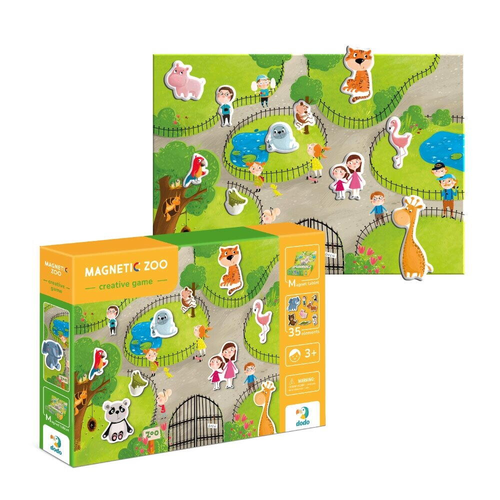 setul include o plansa magnetica cu un peisaj de la zoo. Copiii se pot juca folosind plansa magnetica speciala sau orice alta suprafata magnetica
