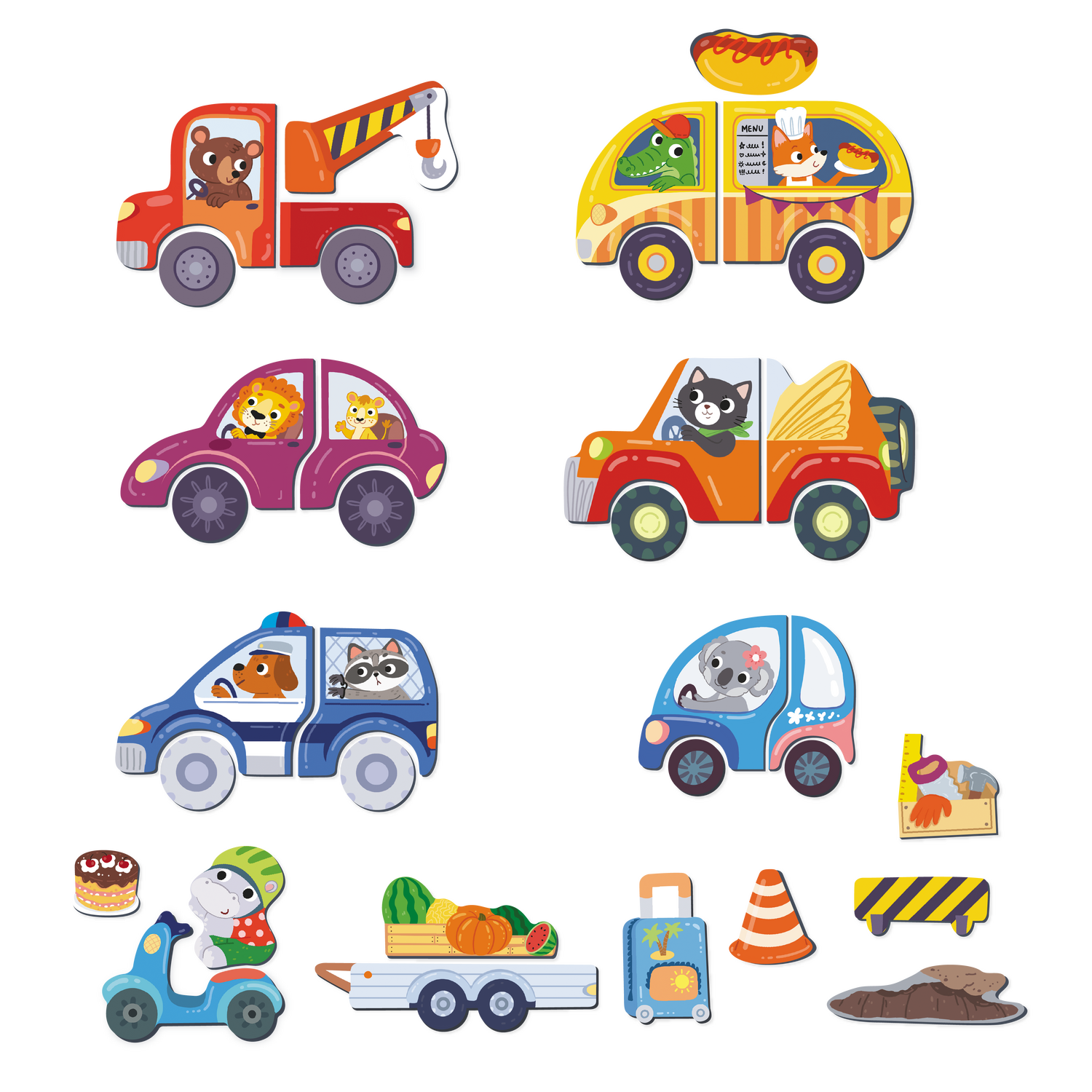 - piese magnetice viu colorate ii vor ajuta pe cei mici sa invete diferite mijloace de transport si favorizeaza conversatii cu tematica "la plimbare"
