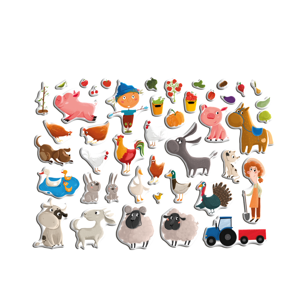 - 44 magneti cu elemente de la ferma (fermier, animalute, tractor, sperietoare de ciori etc.)