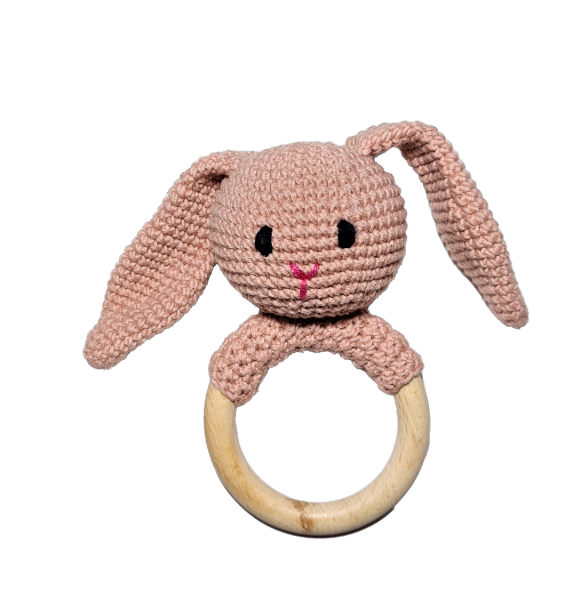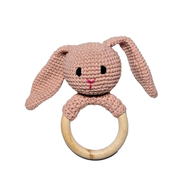 Fatuca prietenoasa a iepurasului, ii va bine dispune pe cei mici, iar inelului din lemn, le va reduce durerea cauzata de aparitia primilor dintisori.
