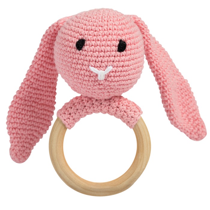 Fatuca prietenoasa a iepurasului, ii va bine dispune pe cei mici, iar inelului din lemn, le va reduce durerea cauzata de aparitia primilor dintisori.
