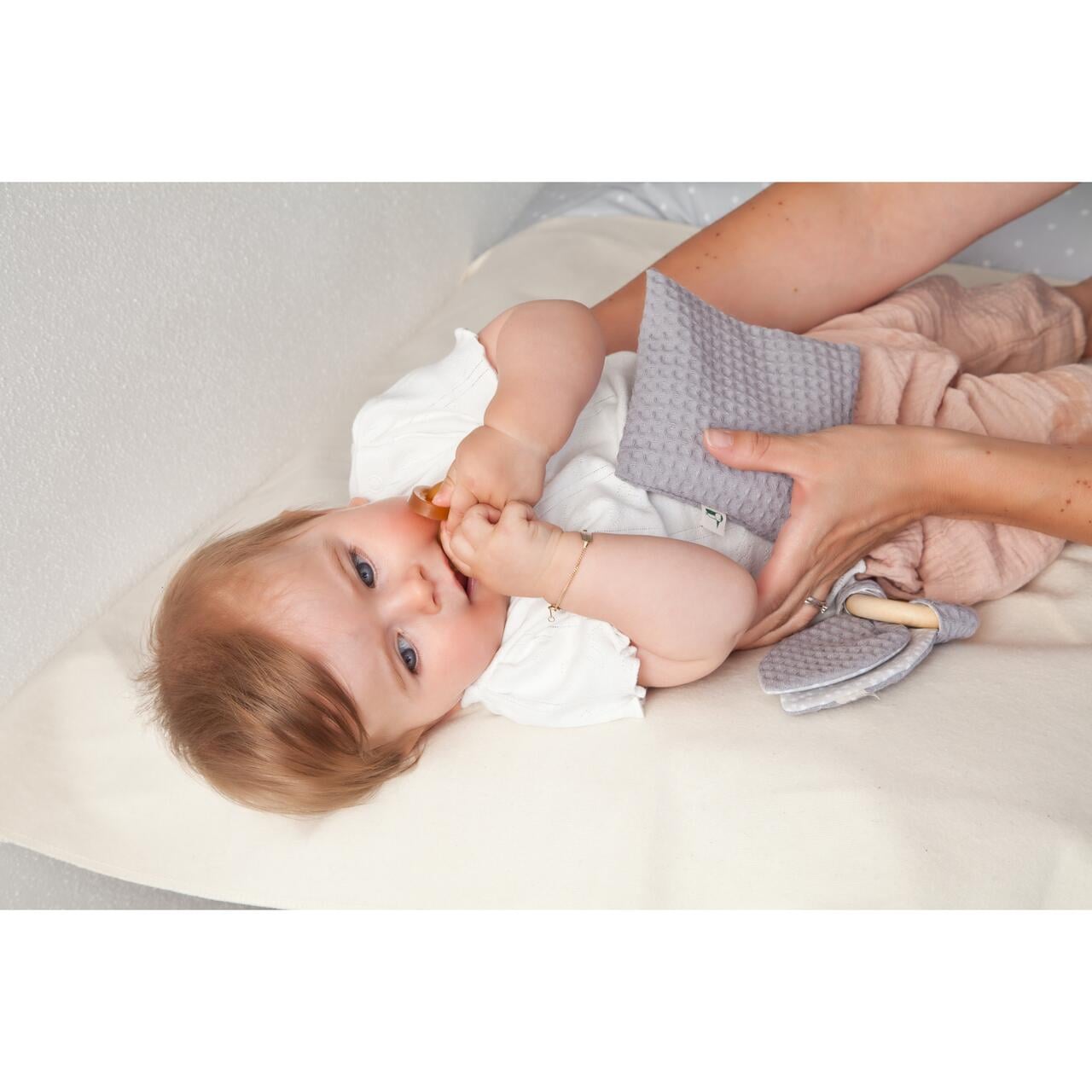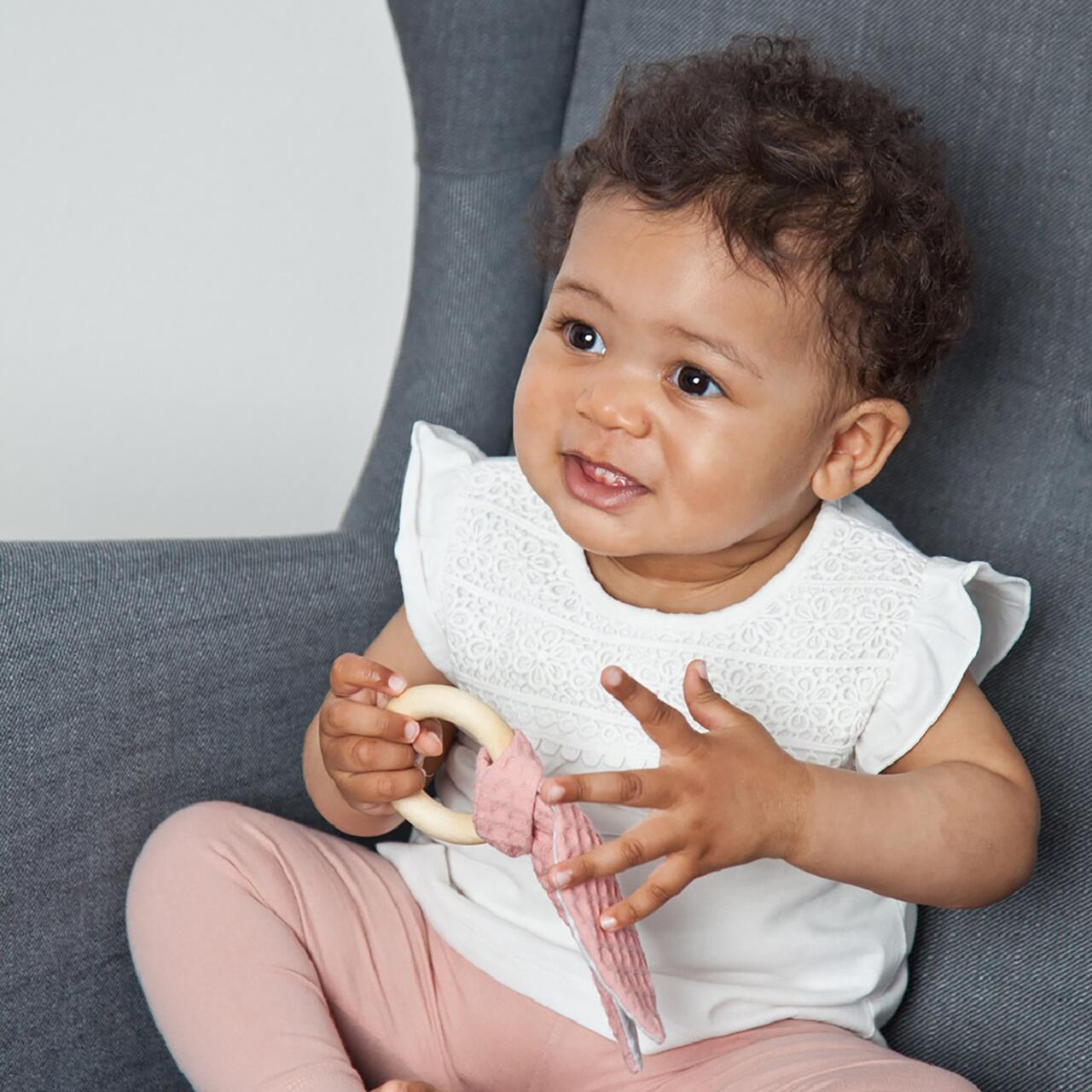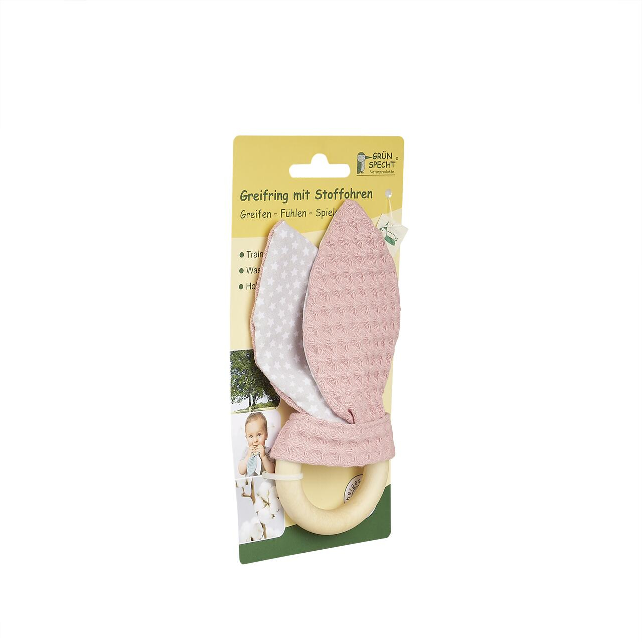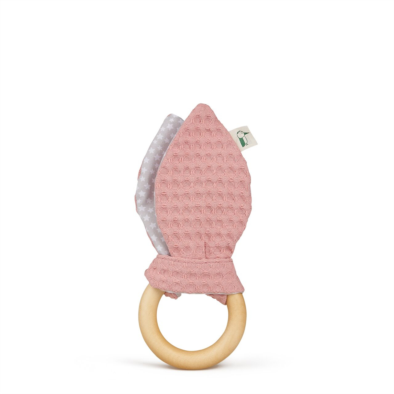 Aceasta jucarie cu aspect atragator, este potrivita pentru bebelusi in perioada de dezvoltare pentru ca antreneaza simtul tactil, avand doua parti componente diferite: partea tare in forma unui inel din lemn masiv și partea mai moale, in forma a doua urechi flexibile de iepuras din bumbac. In acest fel, bebelusul tau este invitat sa exploreze cu mainile si cu gura, oferindu-i primele experiente de a se juca cu diferite forme si structuri si antrenandu-i astfel capacitatea de a intelege si simtul tactil in acelasi timp.Instructiuni de ingrijire: Curatati inainte de prima utilizare si in mod regulat dupa aceea. Pentru a face acest lucru, separati inelul de lemn de partea din material textil. Pentru a curata inelul de lemn, stergeti cu o carpa umeda. Nu utilizati agenti de curatare abrazivi! Urechile de iepure pot fi spalate la masina la 30 °C. Apoi uscati-le intr-o zona curata si bine ventilata. ATENTIE: Dupa spalare, legati ferm urechile de iepuras pe inelul de lemn!Specificatiile produsului:Inel de jucarie pentru dezvoltarea simtului tactil, din material textil si lemn;Material urechi de iepuras: 100% bumbac; pot fi spalate la 30°C in masina de spalat;Material inel: lemn de artar, provenit din culturi durabile;Culoare urechi de iepuras: roz.Certificare CE de siguranta pentru jucarii Fabricat in Europa