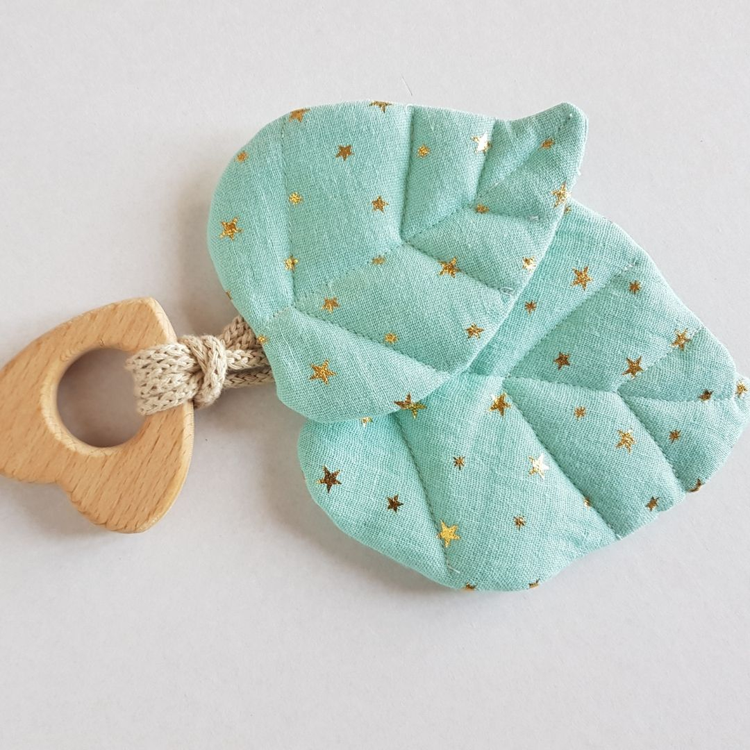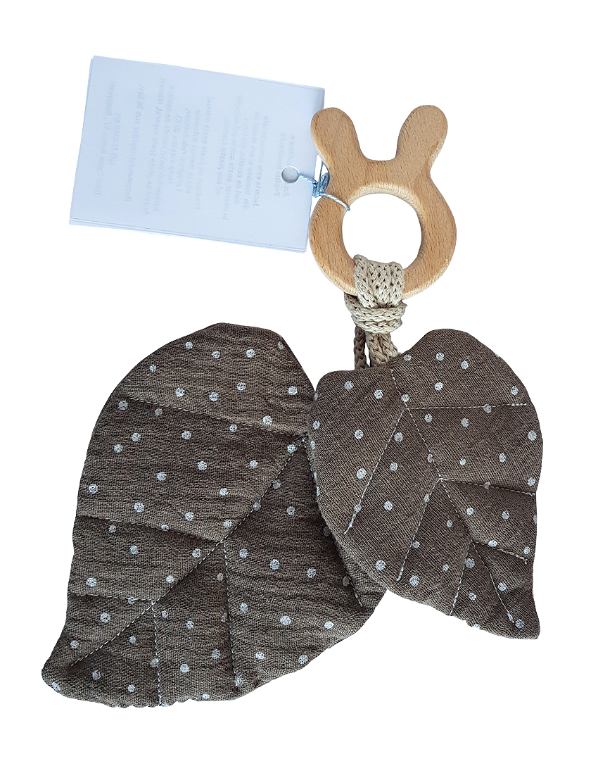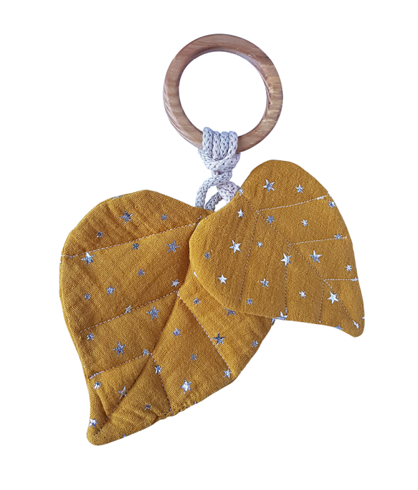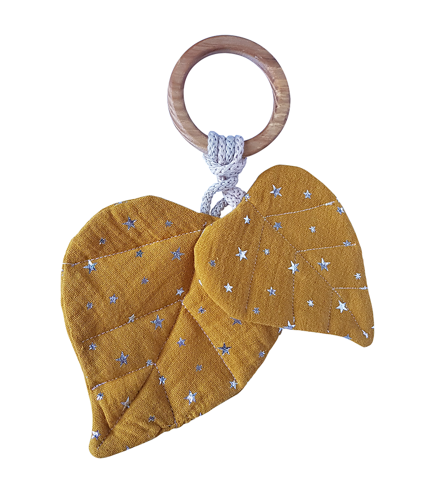 Jucarie dentitie - Frunze galben/maroJucaria pentru dentitie este fabricata in serie mica, lucrata cu drag si atentie intr-un atelier pentru jucarii handmade. Frunzele din muselina sunt atasate de un inel din lemn sau de o figurina din lemn.In interiorul frunzei, este inserata o bucatica de material care fosneste atunci cand frunza este stransa sau apasata.Material: