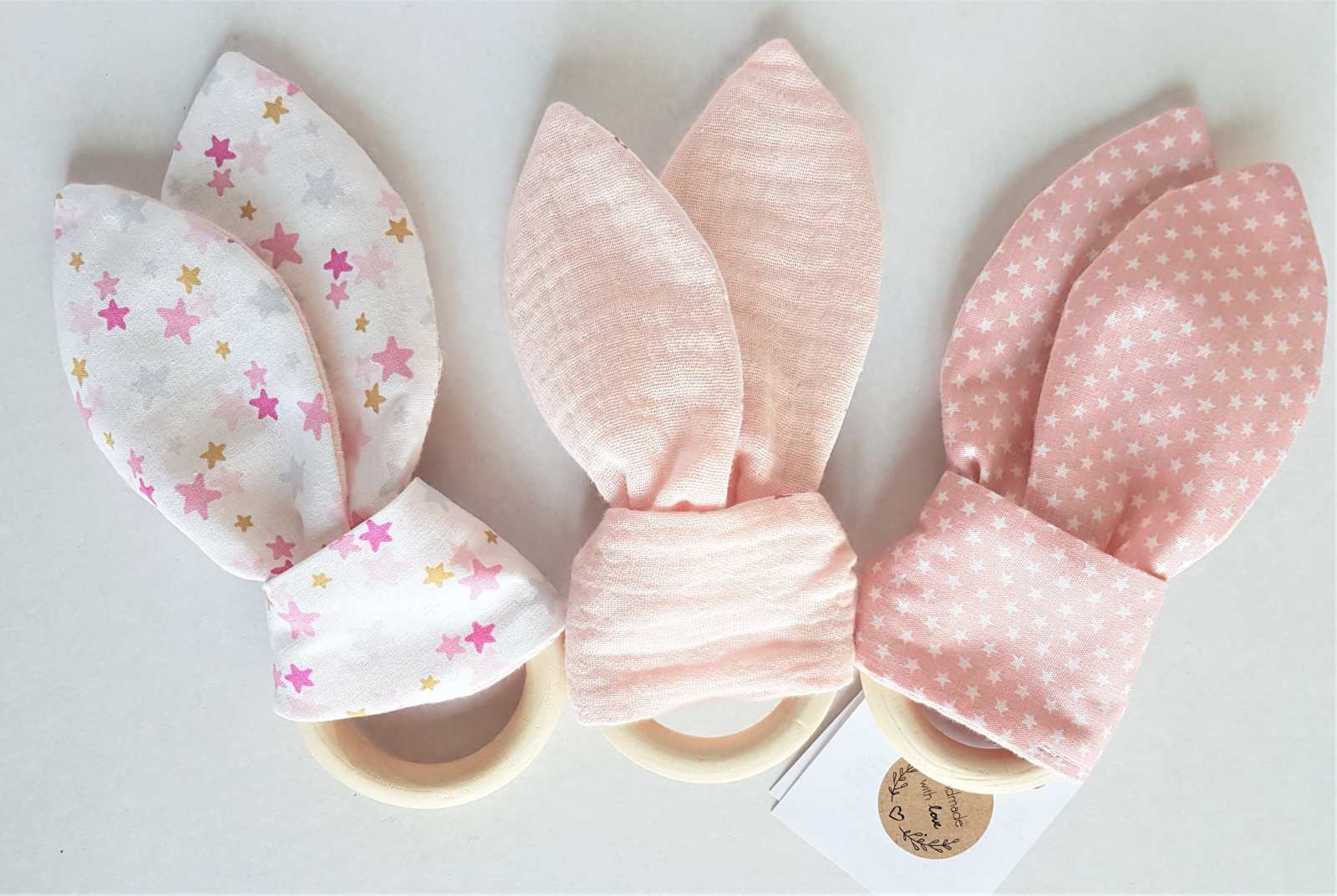 Jucarie dentitie - Urechiuse iepuras Jucaria pentru dentitie Urechiuse este fabricata in serie mica, lucrata cu drag si atentie intr-un atelier pentru jucarii handmade. Urechiusele iepurasului sunt confectionate din panza si muselina si sunt atasate de un inel din lemn. Material: bumbac / lemn