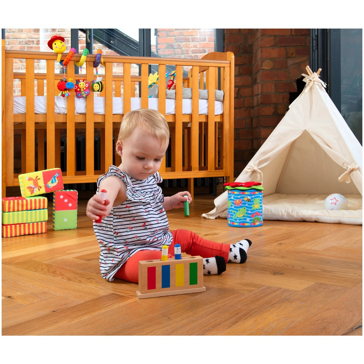 jucarie din lemn amuzanta, conceputa pentru stimularea activitatii de asociere si pentru a incuraja coordonarea mana-ochi a celui mic