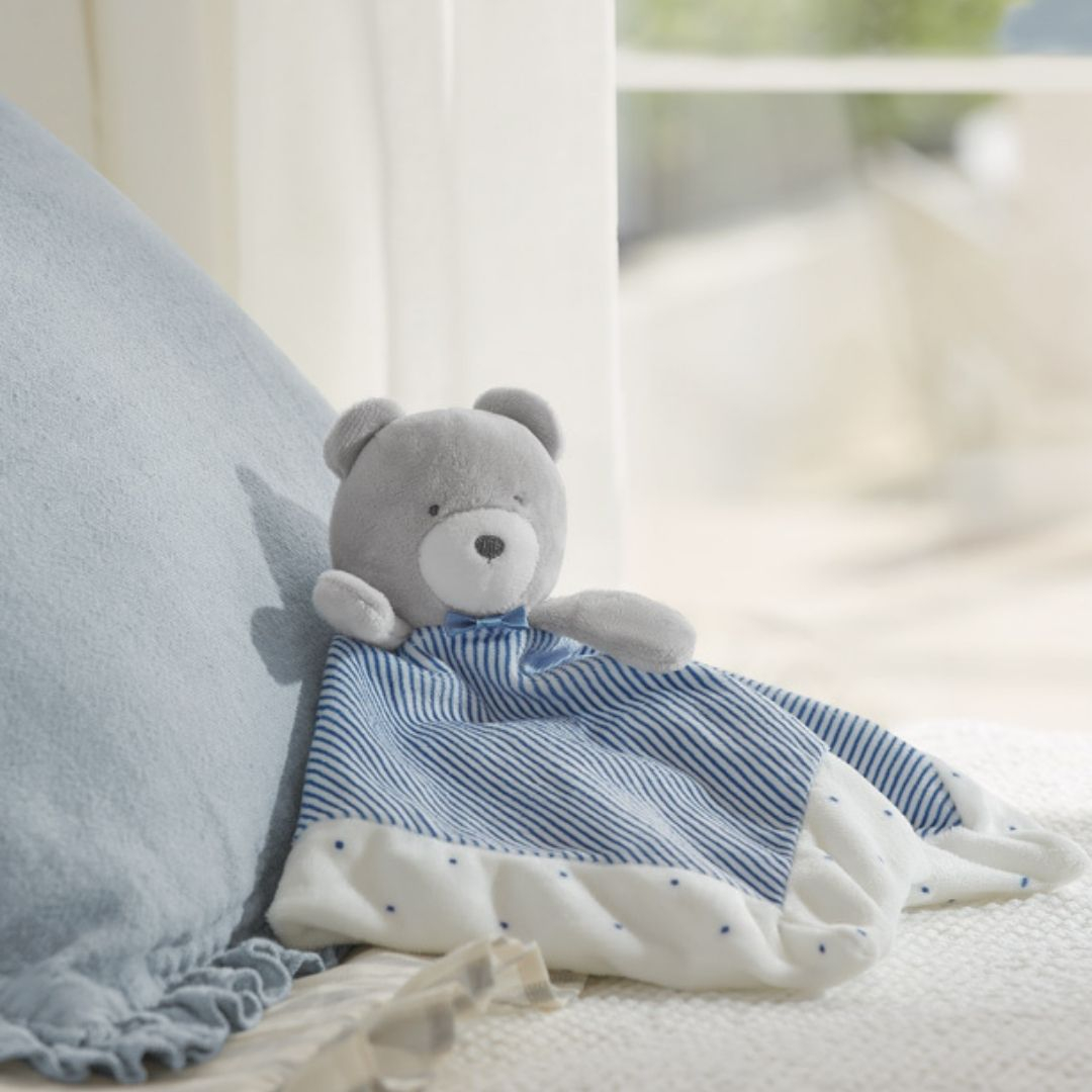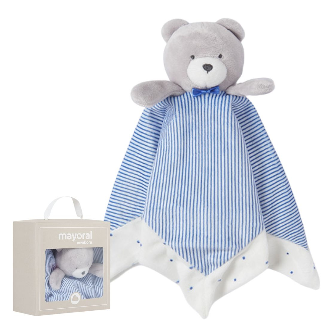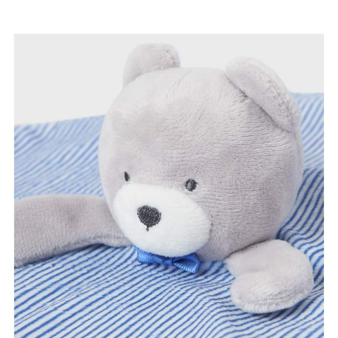Jucarie gugu Urs bleu- MayoralUrsulet de plus pentru bebe (gugu) dintr-o textura moale si care va fi compania perfecta pentru momentele de odihna si de joaca. Ursuletul are o fundita la gat atasata. detaliu. Jucaria vine ambalata intr-o cutiuta de carton si poate fi oferit in dar de bun venit micutlui bebe!Culoare: bleu/gri/alb batistuta: 33x33 cm ursuletul si batistuta 30 cm Material: Exterior 100% Poliester Captuseala 100% Poliester Umplutura 100% Poliester