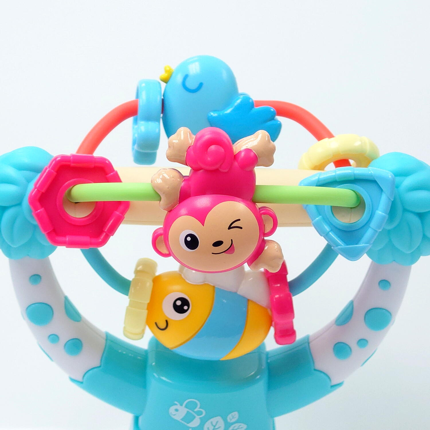 jucaria include un carusel rotativ cu animalute simpatice – maimuta, albina si pasare – care se invart captivand atentia copilului
