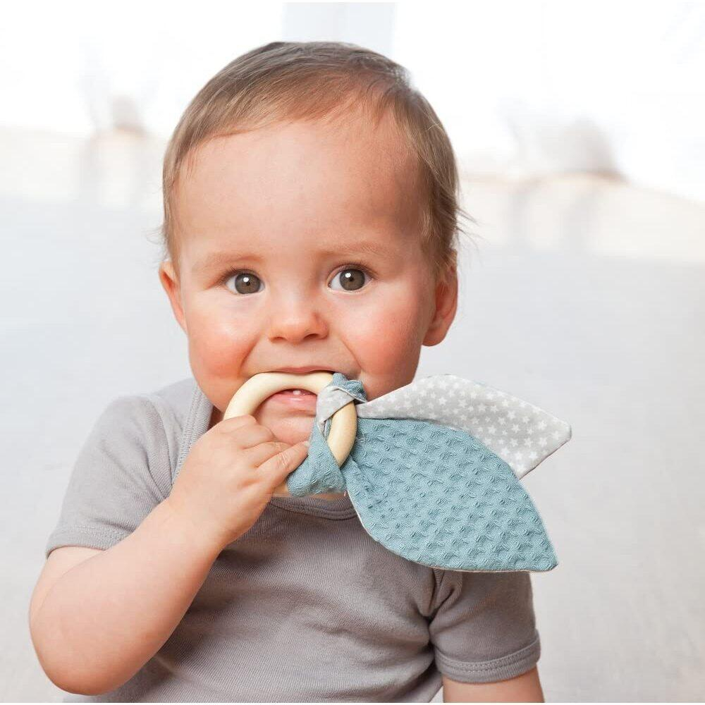 Aceasta jucarie cu aspect atragator, este potrivita pentru bebelusi in perioada de dezvoltare pentru ca antreneaza simtul tactil, avand doua parti componente diferite: partea tare in forma unui inel din lemn masiv și partea mai moale, in forma a doua urechi flexibile de iepuras din bumbac organic. In acest fel, bebelusul tau este invitat sa exploreze cu mainile si cu gura, oferindu-i primele experiente de a se juca cu diferite forme si structuri si antrenandu-i astfel capacitatea de a intelege si simtul tactil in acelasi timp.Instructiuni de ingrijire: Curatati inainte de prima utilizare si in mod regulat dupa aceea. Pentru a face acest lucru, separati inelul de lemn de partea din material textil. Pentru a curata inelul de lemn, stergeti cu o carpa umeda. Nu utilizati agenti de curatare abrazivi! Urechile de iepure pot fi spalate la masina la 30 °C. Apoi uscati-le intr-o zona curata si bine ventilata. ATENTIE: Dupa spalare, legati ferm urechile de iepuras pe inelul de lemn!Specificatiile produsului:Inel de jucarie pentru dezvoltarea simtului tactil, din material textil si lemn;Material urechi de iepuras: 100% bumbac cultivat organic; pot fi spalate la 30°C in masina de spalat.Material inel: lemn de artar provenit din culturi durabile;Culoare urechi de iepuras: gri-petrolCertificare CE de siguranta pentru jucarii Fabricat in Europa