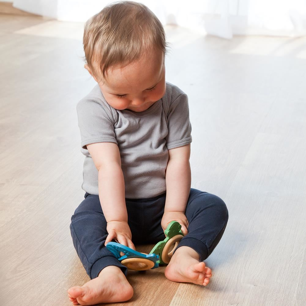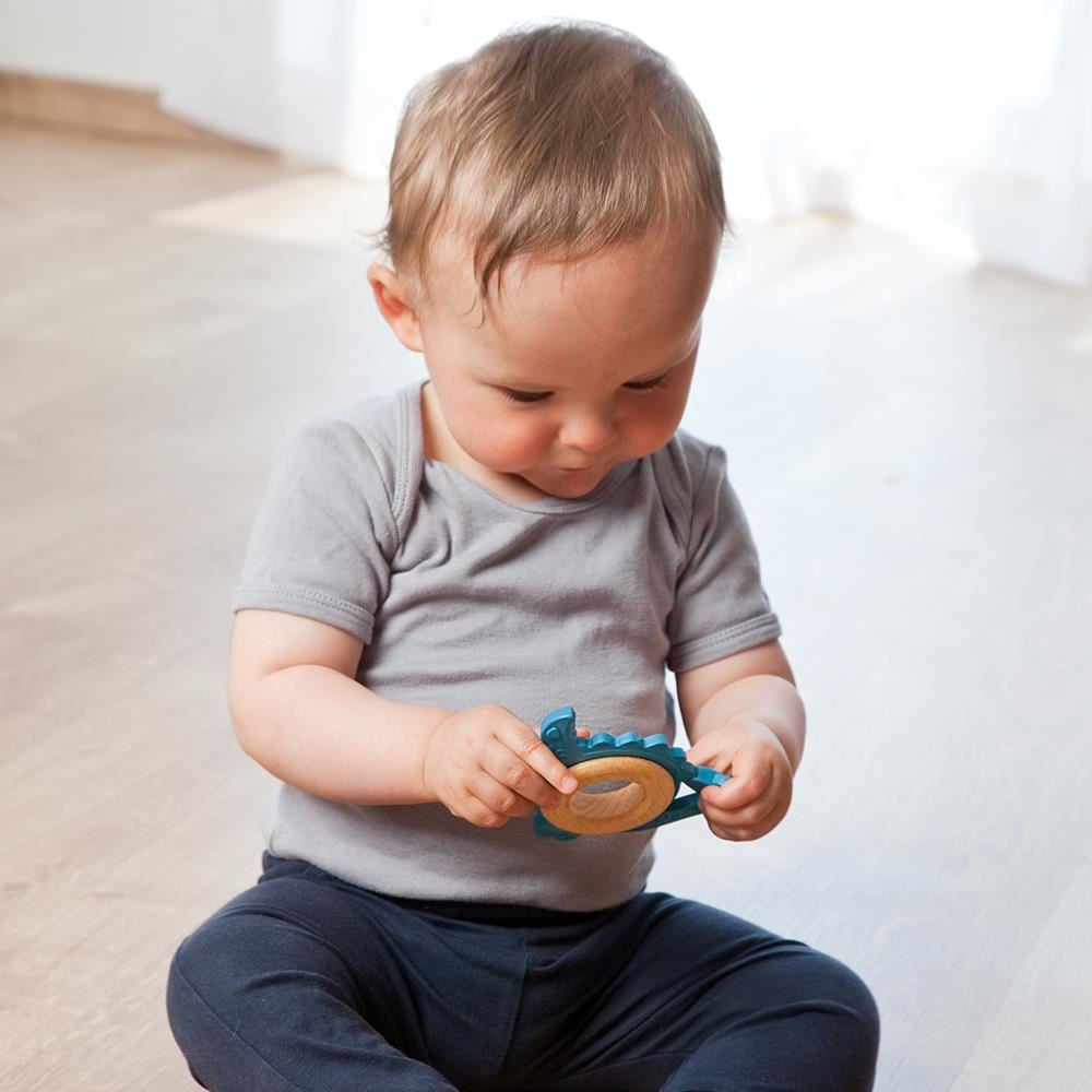 Bebelusii descopera lumea cu gura, mainile si ochii. Forma naturala a jucariilor noastre starneste curiozitatea celor mici si invita mainile bebelusului sa exploreze. In acest fel, pot lua contact in mod jucaus si avea primele experiente cu diferite forme și structuri, iar simtul tactil si prinderea sunt antrenate pe parcurs. Jucaria pentru bebelusi in forma de dinozaur, din cauciuc natural si lemn, este destinata jocului si rosului. Partea externa din cauciuc organic le este de ajutor bebelusilor pentru a sustine procesul de dentitie. Datorita suprafetei sale structurate si a structurii moi, maseaza usor gingiile bebelusului in timp ce o mesteca.Forma ergonomica si inelul din lemn il ajuta pe bebelus sa apuce jucaria si sa o muste si roada. Specificatiile produsului- Jucarie din cauciuc natural organic, sigura pentru a fi roasa- Inel interior din lemn pentru o prindere mai usoara- Suprafata structurata pentru masajul gingiilor- Sustine dentitia bebelusilor in procesul natural de crestere.- Fara BPA si ftalati- Material: cauciuc natural organic si lemn- Forma de dinozaur- Asamblat in ateliere pentru persoane cu dizabilitati