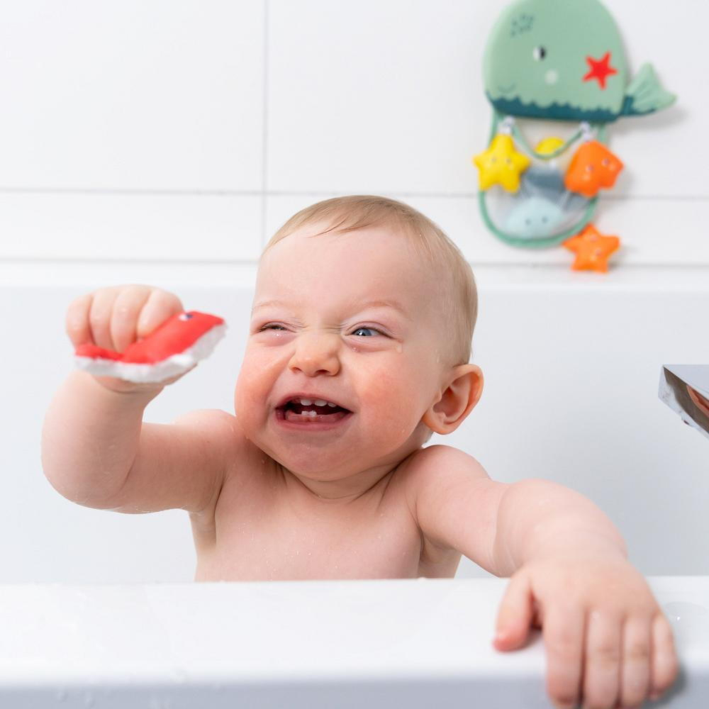 ataseaza jucaria cu usurinta pe peretii din baie, multumita ventuzelor apoi depoziteaza in plasa sa, jucariile de baie mici care te vor insoti in aventurile subacvatice