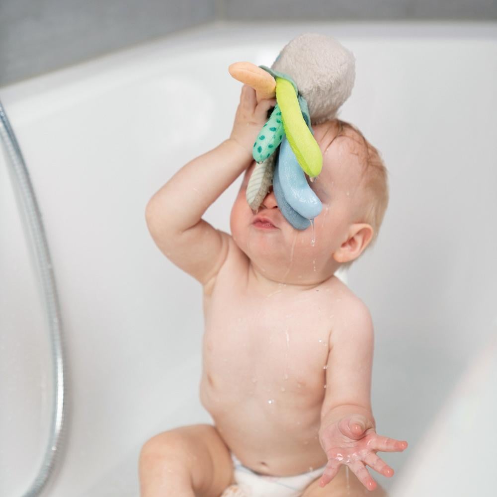 datorita unei mingi incorporate, micuta caracatita inoata fericita pe suprafata apei ce asigura distractie atunci cand copilul face baie