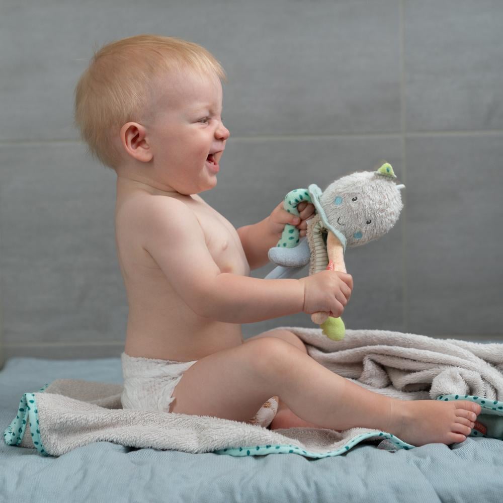 jucaria este confectionata dintr-un material moale, placut la atingere ce stimuleaza copilul sa apuce si sa se joace