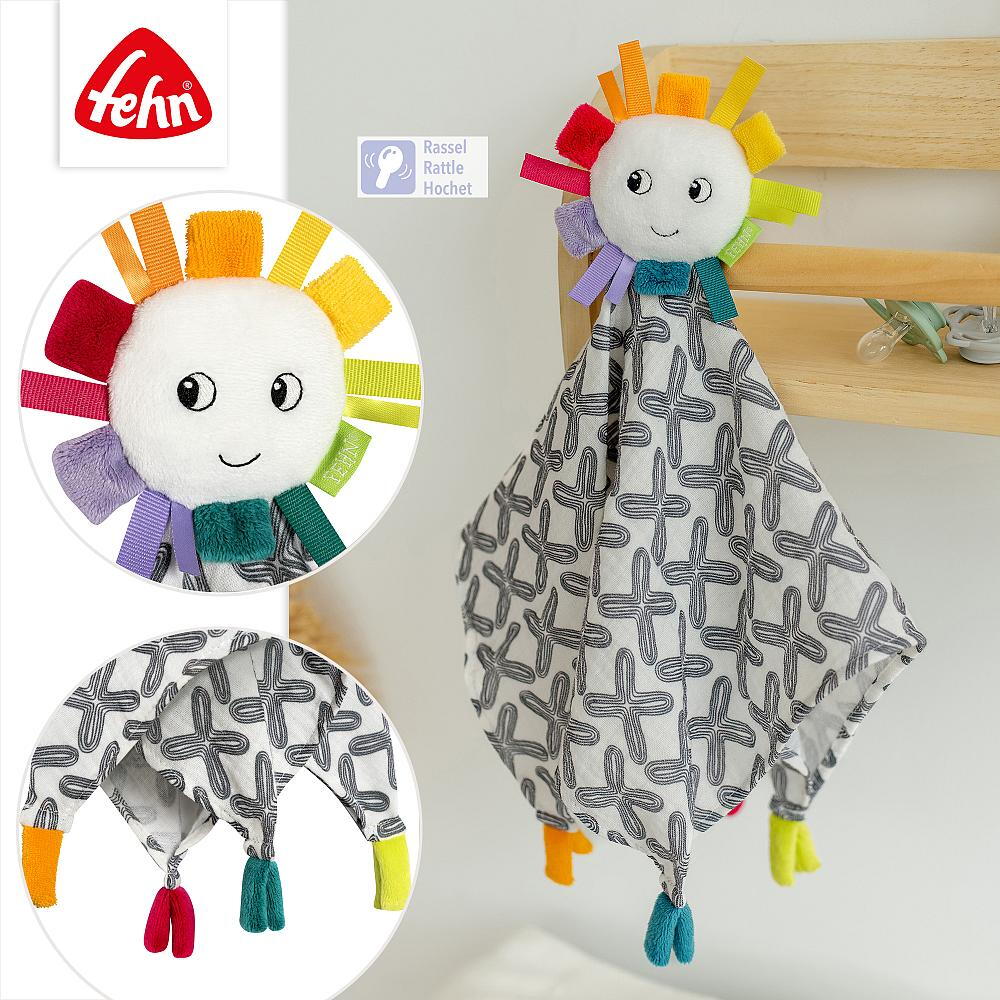 - Creata din muselina moale de bumbac, in combinatie cu materiale prietenoase la atingere, aceasta jucarie multifunctionala este perfecta pentru imbratisat, linistit si stimulat simturile