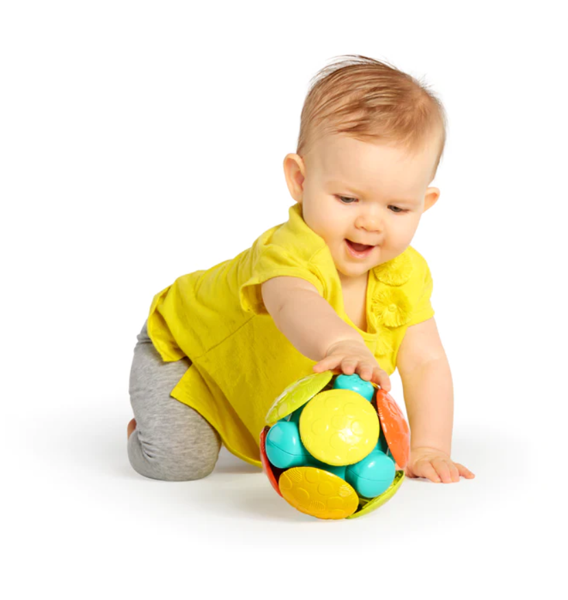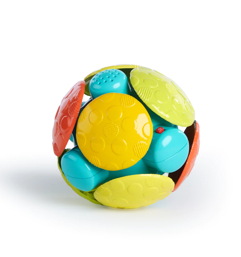 Mingea multicolora Oball de la Bright Starts are 32 de gauri pentru degete care fac ca aceasta jucarie sa fie usor de prins de bebelus. Designul brevetat, neted si flexibil face ca mingea sa...