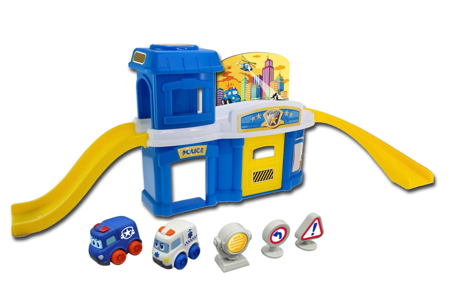 Setul include 11 piese de joc: 2 masinute, semne circulatie, rampe, piese pentru asamblat sectia de politie.