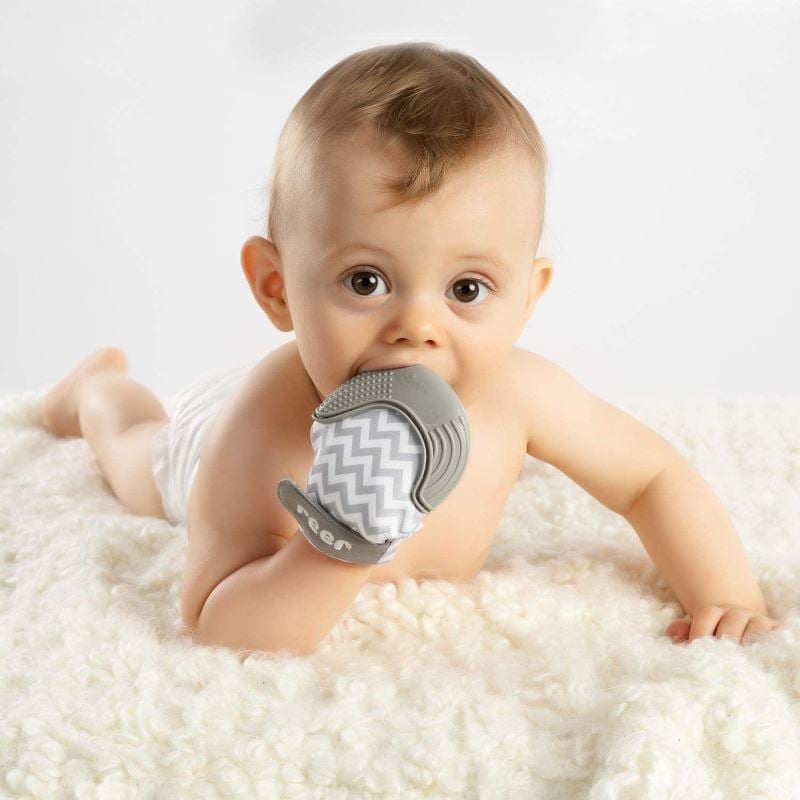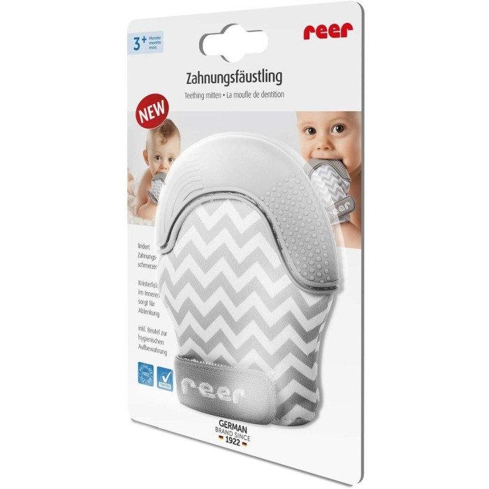 De îndată ce primii dinți mici incep sa apara, gingiile umflate sunt puse sub presiune, aducând celor mici dureri neplăcute si neliniste. Manusa pentru dinți de la Reer ii permite bebelușului să-și atenueze durerea și-i oferă o distragere. - Jucarie pentru dinți ce ajuta la atenuarea durerii în timpul eruptiei dentare si protejeaza pielea sensibila de pe mainile bebelusului.- Diminuează durerea și distrage atenția de la durerea de dinti, mulțumită diverselor optiuni de masaj și a suprafetelor denivelate ce ofera senzatii variate in gura. Gingiile dureroase sunt masate plăcut prin mestecarea blândă.- In acelasi timp protejeaza pielea sensibilă de pe mâinile bebelușului de a fi mestecată.- Extrem de confortabila de purtat datorită materialului moale, absorbant, ce inhiba excesul de salivă, protejând micile mâini delicate de a se inflama.- Căptușeala interioară moale este respirabilă și garantează o atmosferă plăcută în mănușă, pentru un confort crescut.- Dimensiunea manusii poate fi ajustată individual, datorită dispozitivului de fixare integrat cu arici. Acesta asigură o potrivire optimă la încheietura mâinii, ceea ce înseamnă că bebelușul nu poate scoate manusa din neatenție.- Datorită formei sale largi, mănușa este potrivită pentru mâinile bebelușilor și copiilor mici. Poate fi purtata atât pe mana dreaptă, cât și pe cea stângă.- Include husa de protectie pentru transportul si depozitarea igienica, ce impiedica manusa sa se murdareasca, dar impiedica si contaminarea celorlate obiecte de catre manusa folosita.- Sigura pentru alimentatie si inofensiva, datorita materialelor de înaltă calitate. Reer garanteaza ca au fost utilizate numai materiale durabile care nu conțin substanțe dăunătoare și îndulcitori; de asemenea, nu are mirosuri și nu conține BPA, ftalati și PVC.- Usor de curatat, lavabila.- Dimensiuni: 10 x 8 cm