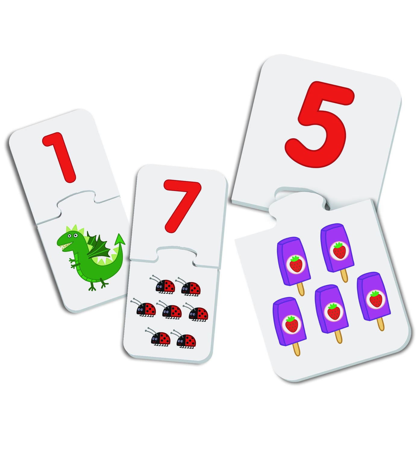 setul contine cartonase imprimate cu cifre si diferite imagini viu colorate pentru o invatare rapida si eficienta prin imbinarea corecta a cartonaselor