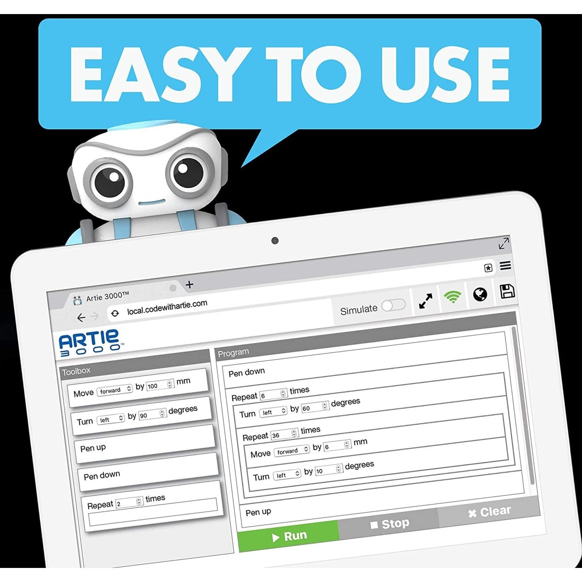 tasteaza codul programat in simulatorul de desen inainte sa il pui pe Artie pe foaia de hartie pentru a desena