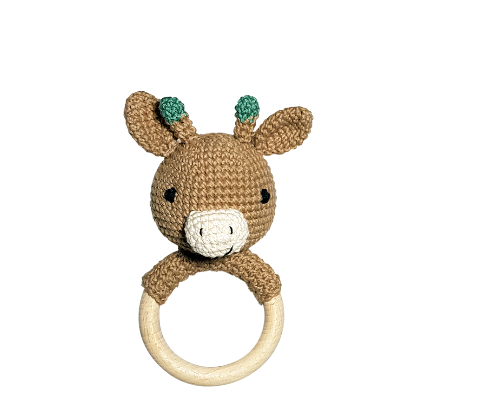 Fatuca prietenoasa a acestuia, ii va bine dispune pe cei mici, iar inelului din lemn, le va reduce durerea cauzata de aparitia primilor dintisori.