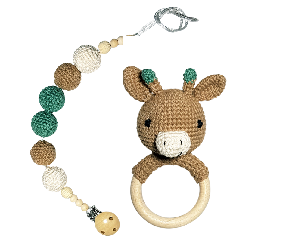 Set jucarii crosetate manual pentru dentitie si suzeta- Girafa - vernil - Maimutzeria TiarraGirafa este prietena bebelusilor, inca din primele luni de viata.