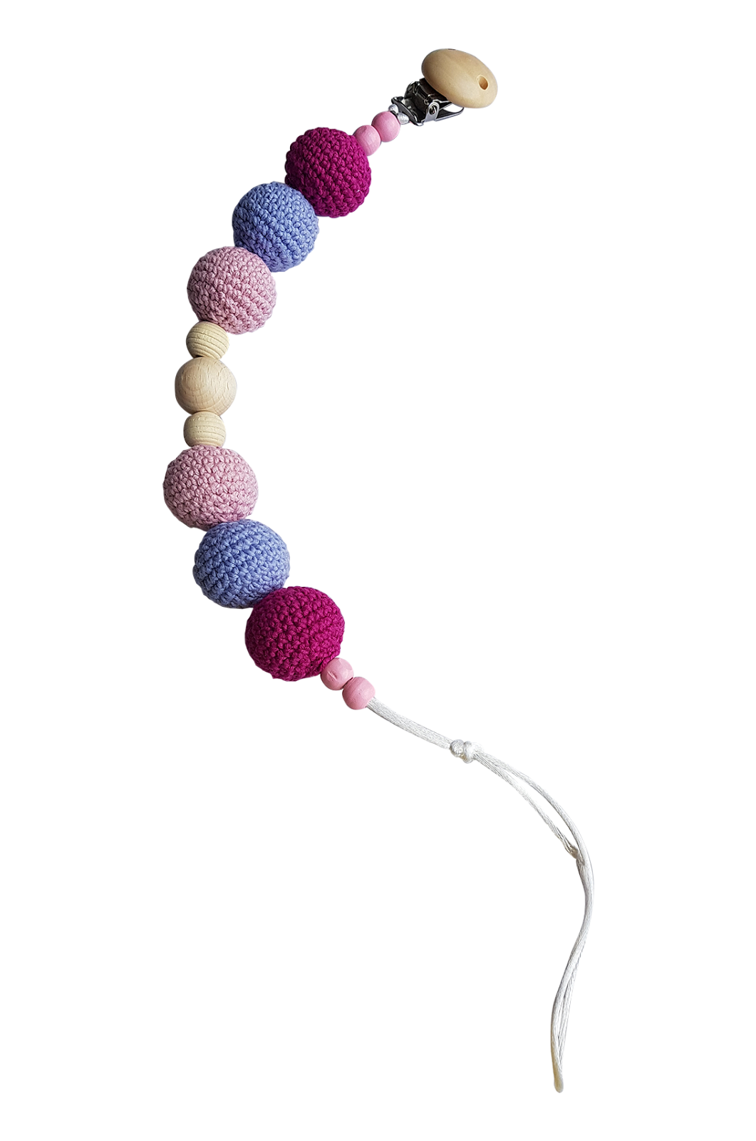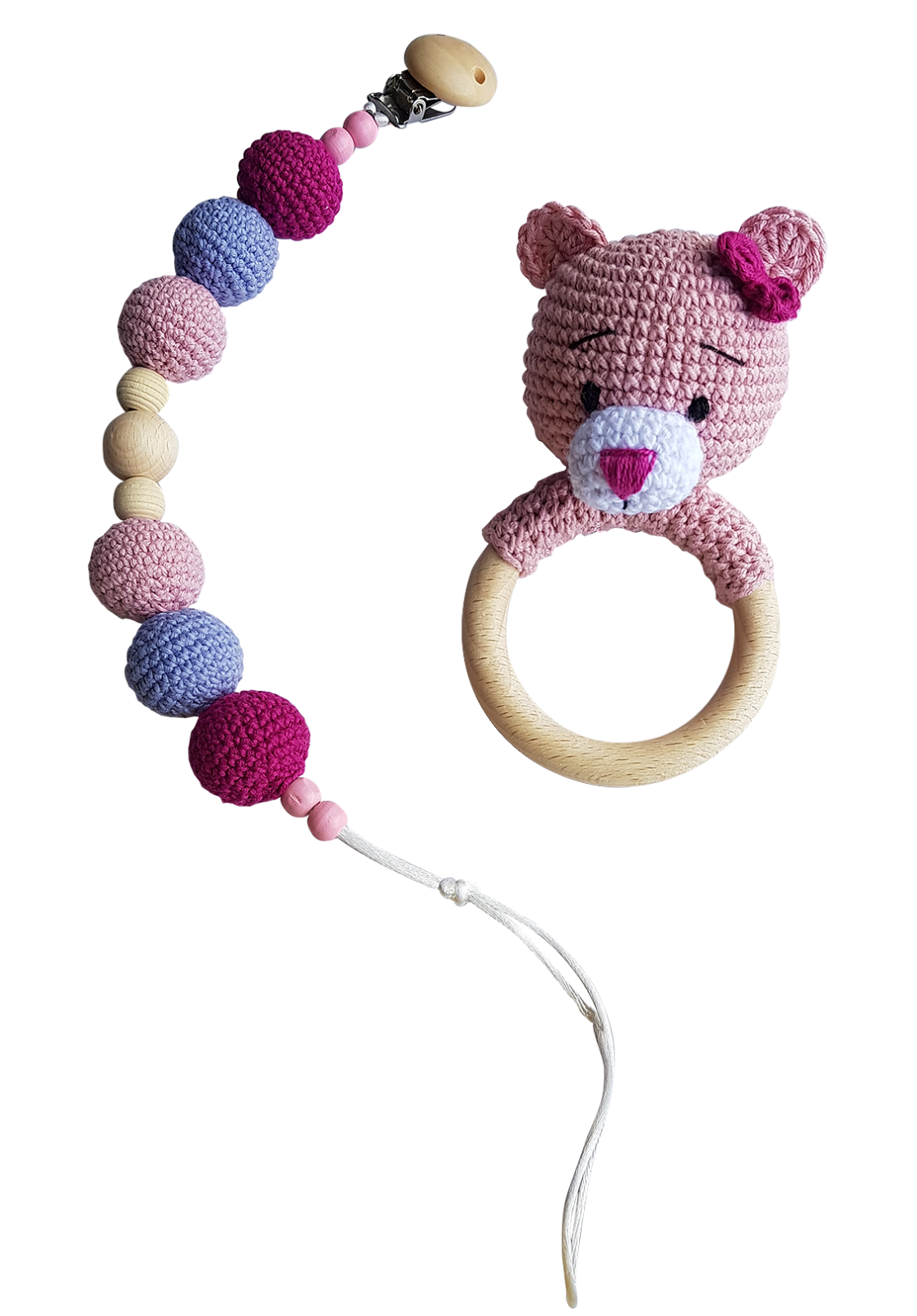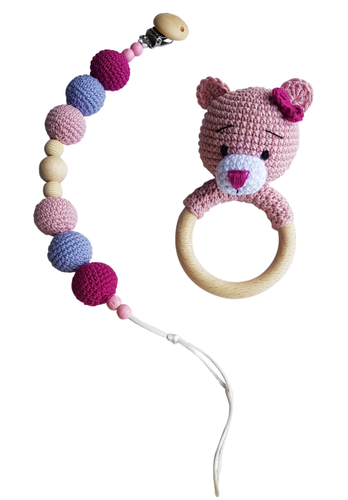Set jucarii crosetate manual pentru dentitie si suzeta - Ursulet roz / magentaUrsuletul este prietenul bebelusilor, inca din primele luni de viata.Setul cuprinde: