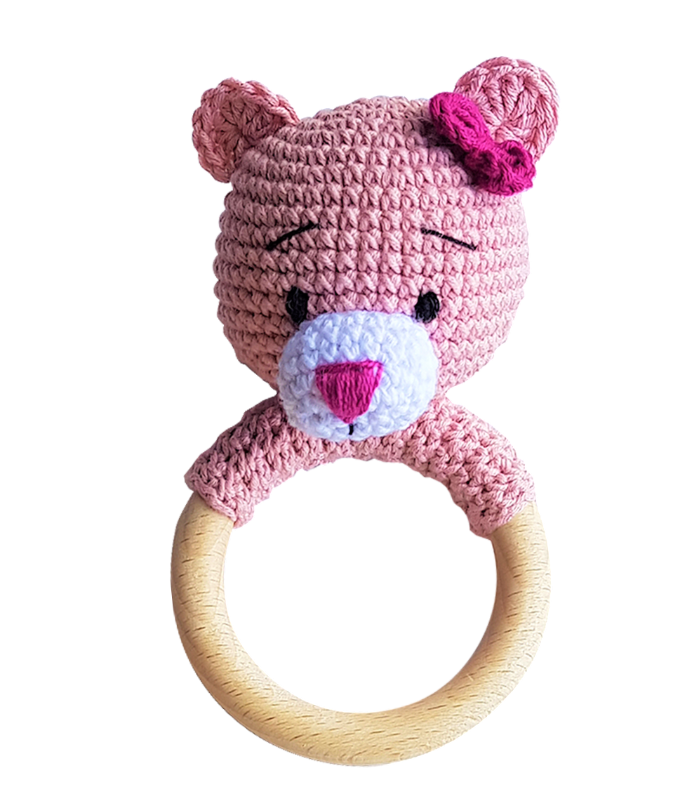 Fatuca prietenoasa a ursuletului, ii va bine dispune pe cei mici, iar inelului din lemn, le va reduce durerea cauzata de aparitia primilor dintisori. Detaliile fetei sunt cusute manual, are aplicata o fundita mica langa urchea stanga.