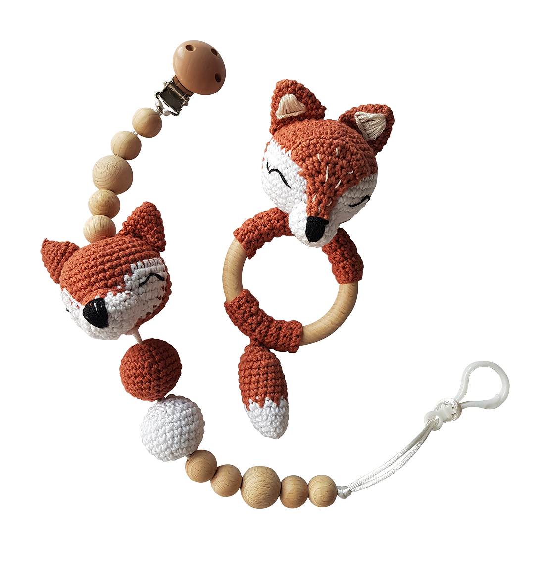 Set jucarii crosetate manual pentru dentitie si suzeta - Vulpita - maro Vulpita este prietena bebelusilor, inca din primele luni de viata.Setul cuprinde:
