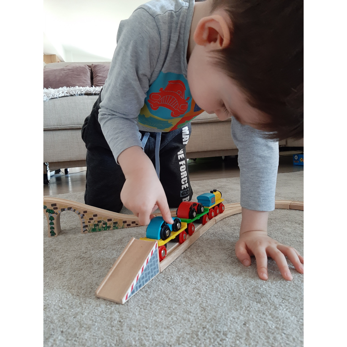Trenuletul este alcatuit din locomotiva si 2 vagoane transportatoare de vehicule, cu sistem de prindere pe baza de magneti.Setul mai este prevazut si cu rampa proprie pentru incarcare / descarcare.Piesele sunt compatibile cu celelalte piese BIGJIGS (cale ferata, trenulet, circuit, poduri, tunele, etc.), cat si cu mare parte din jocurile similare din lemn de pe piata.Jocul dezvolta imaginatia copiilor, fiind ideal in jocurile de rol.Produsul respecta standardele Europene de calitate si siguranta.Material: lemn