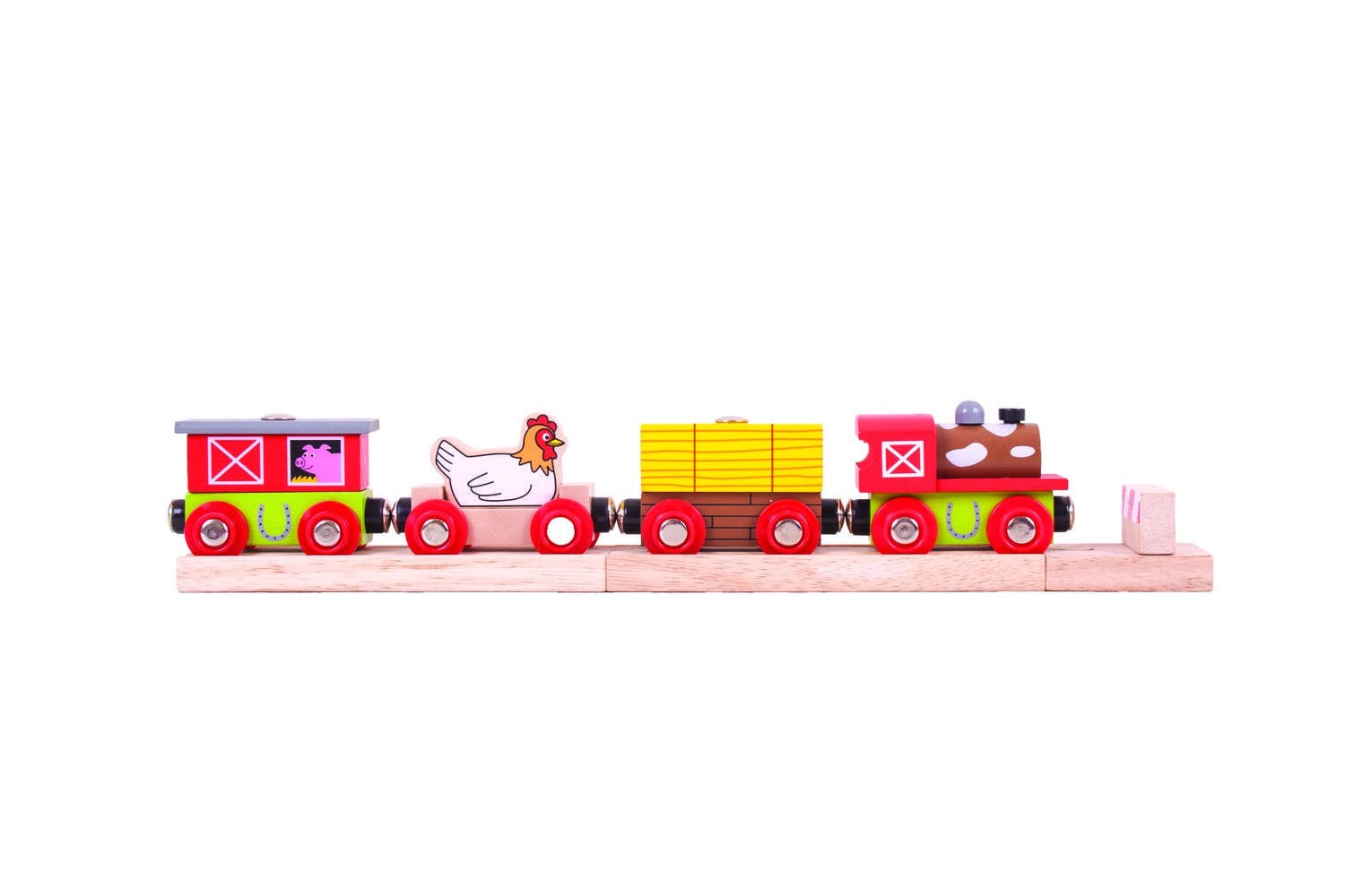 Trenuletul Fermei veselePorneste in marea aventura la ferma, cu noul tau trenulet.Trenuletul este alcatuit din locomotiva si 3 vagoane cu care poti transporta animalutele domestice.El are un sistem de prindere pe baza de magneti.Piesele setului sunt compatibile cu celelalte piese BIGJIGS (cale ferata, trenulet, circuit, poduri, tunele, etc.), cat si cu mare parte din jocurile similare din lemn de pe piata.Jocul dezvolta imaginatia copiilor, fiind ideal in jocurile de rol.Material: lemnVarsta: +3 ani