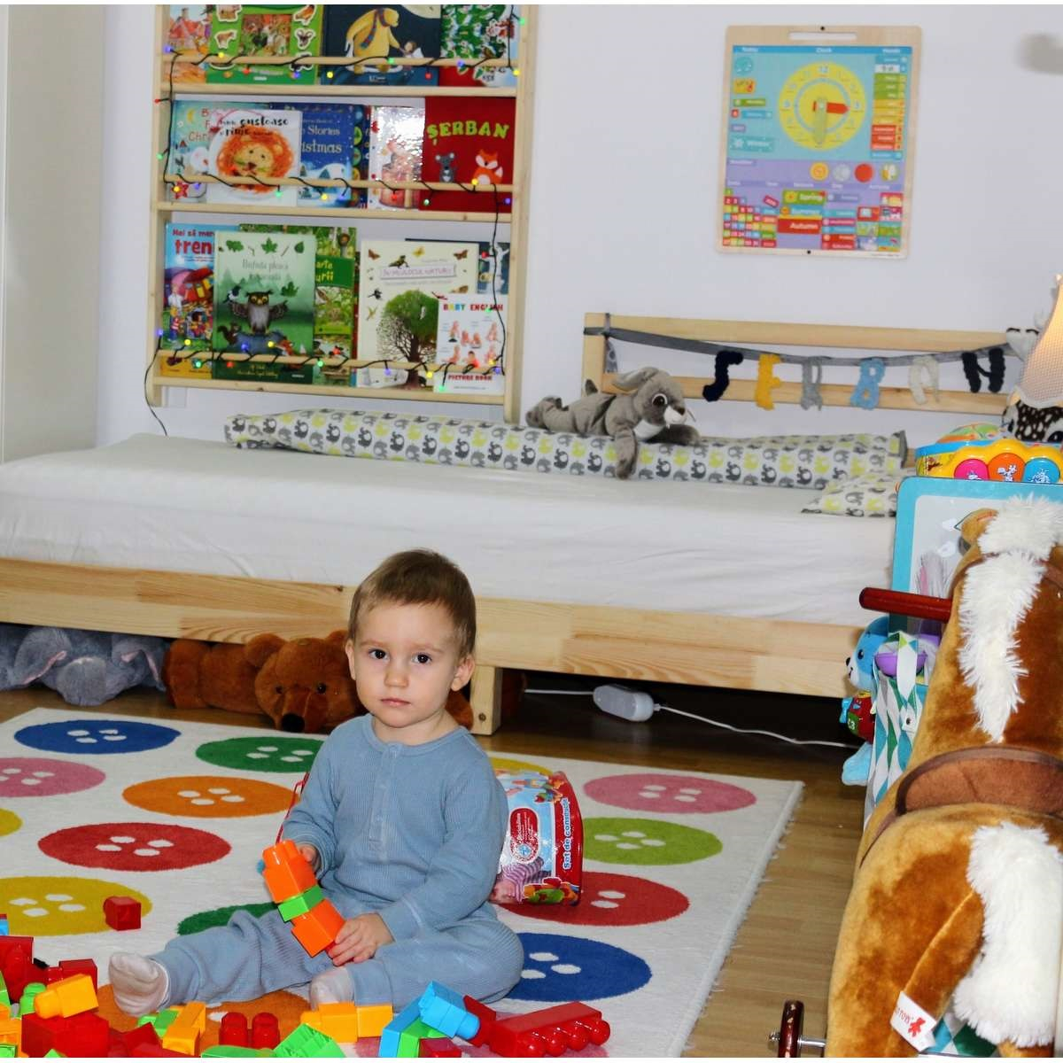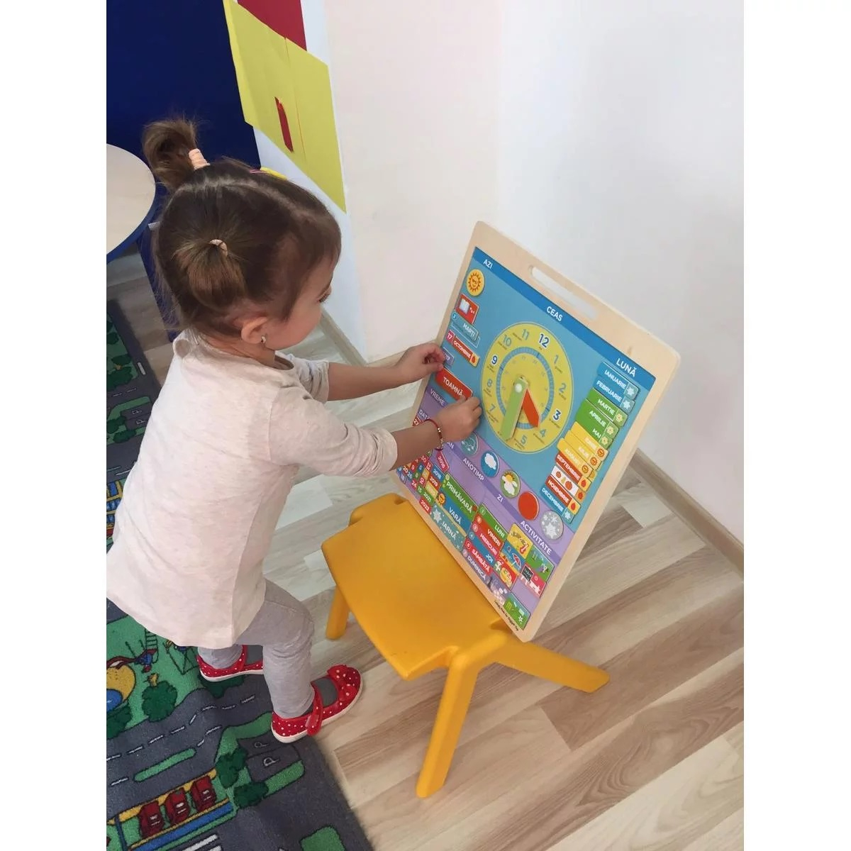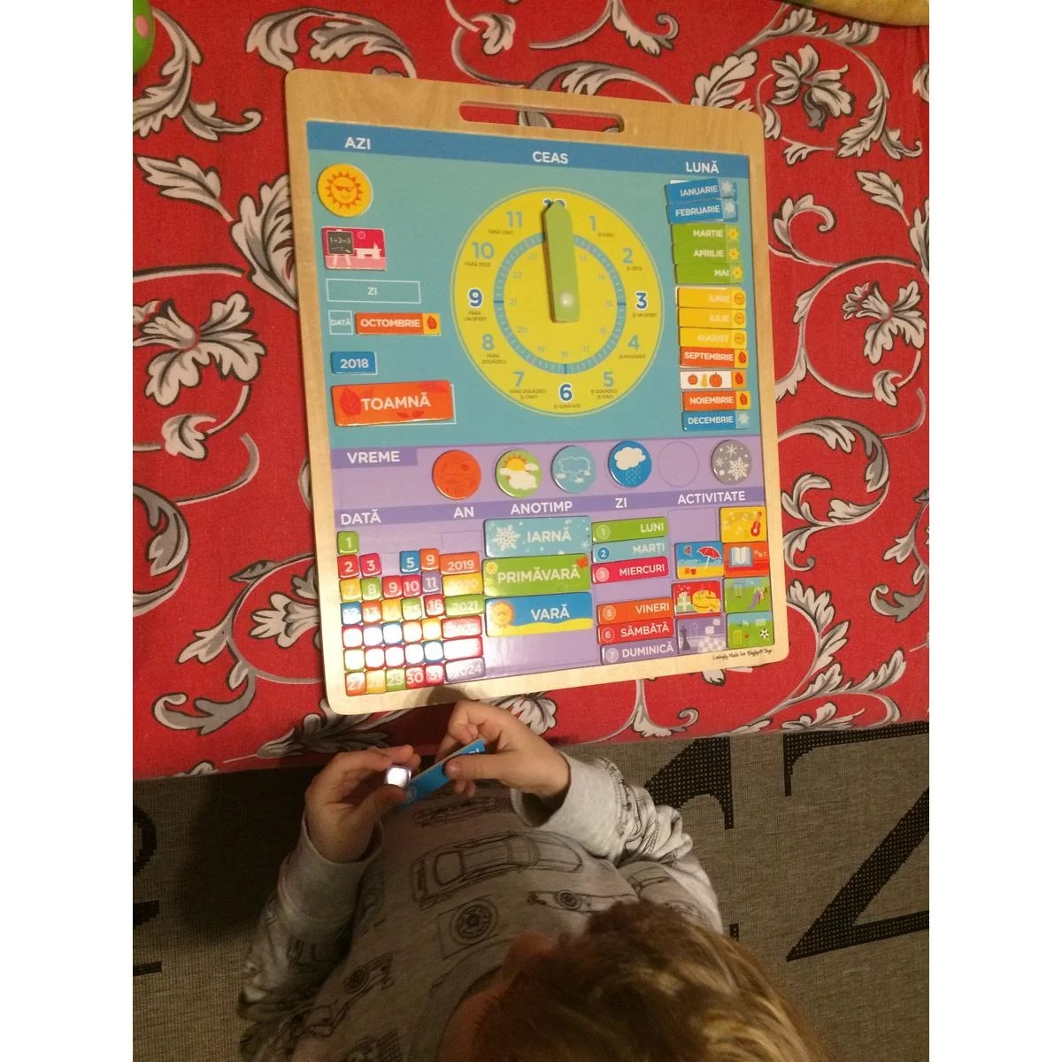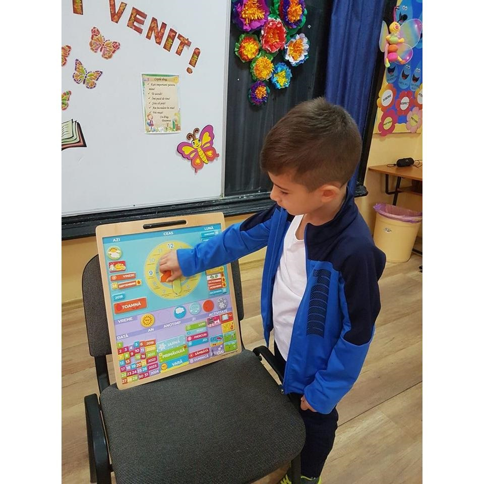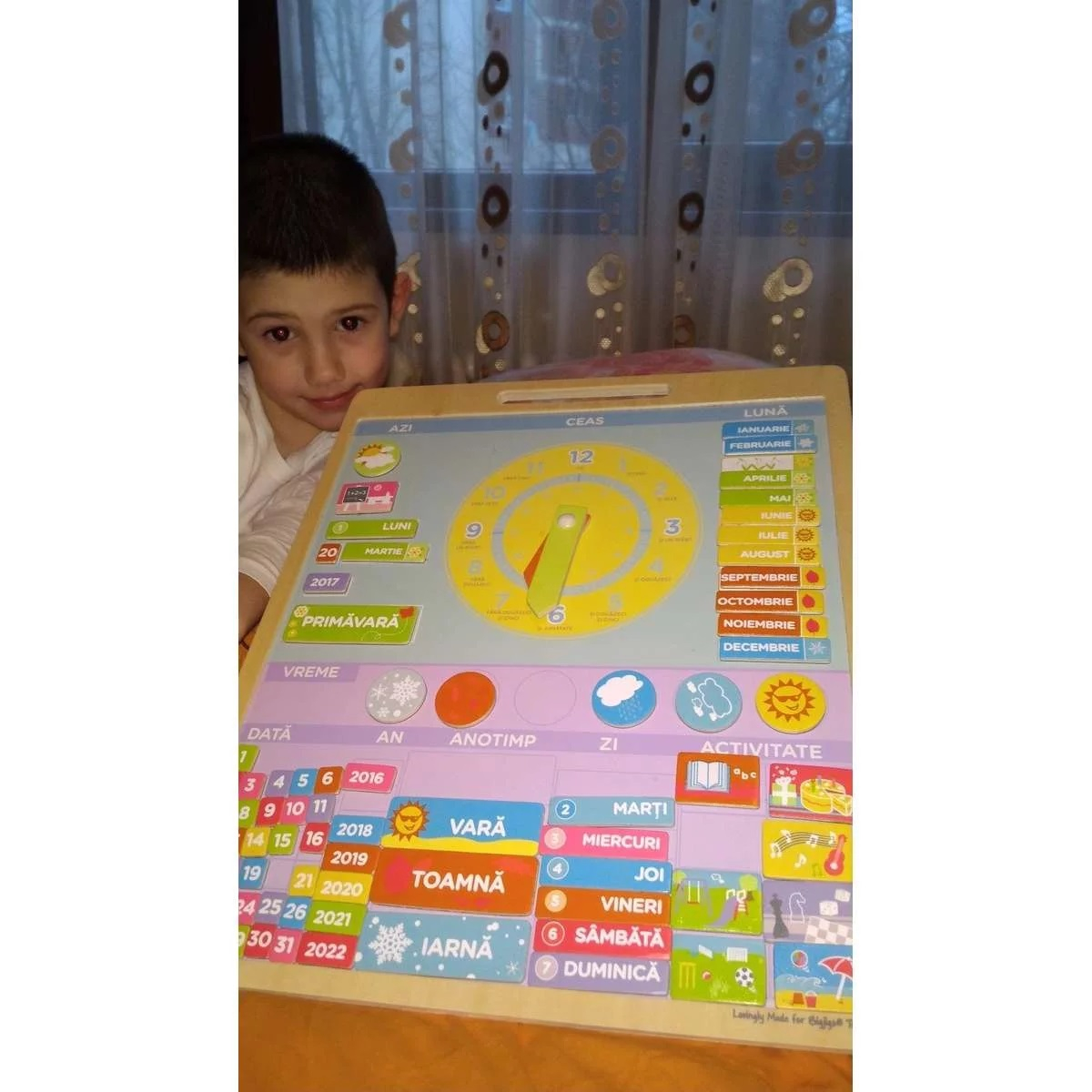 Folosind imaginile si cardurile cu zile si luni, copilul va invata succesiunea anotimpurilor, a lunilor anului, dar si data si ora, cu ajutorul acestui ceas.