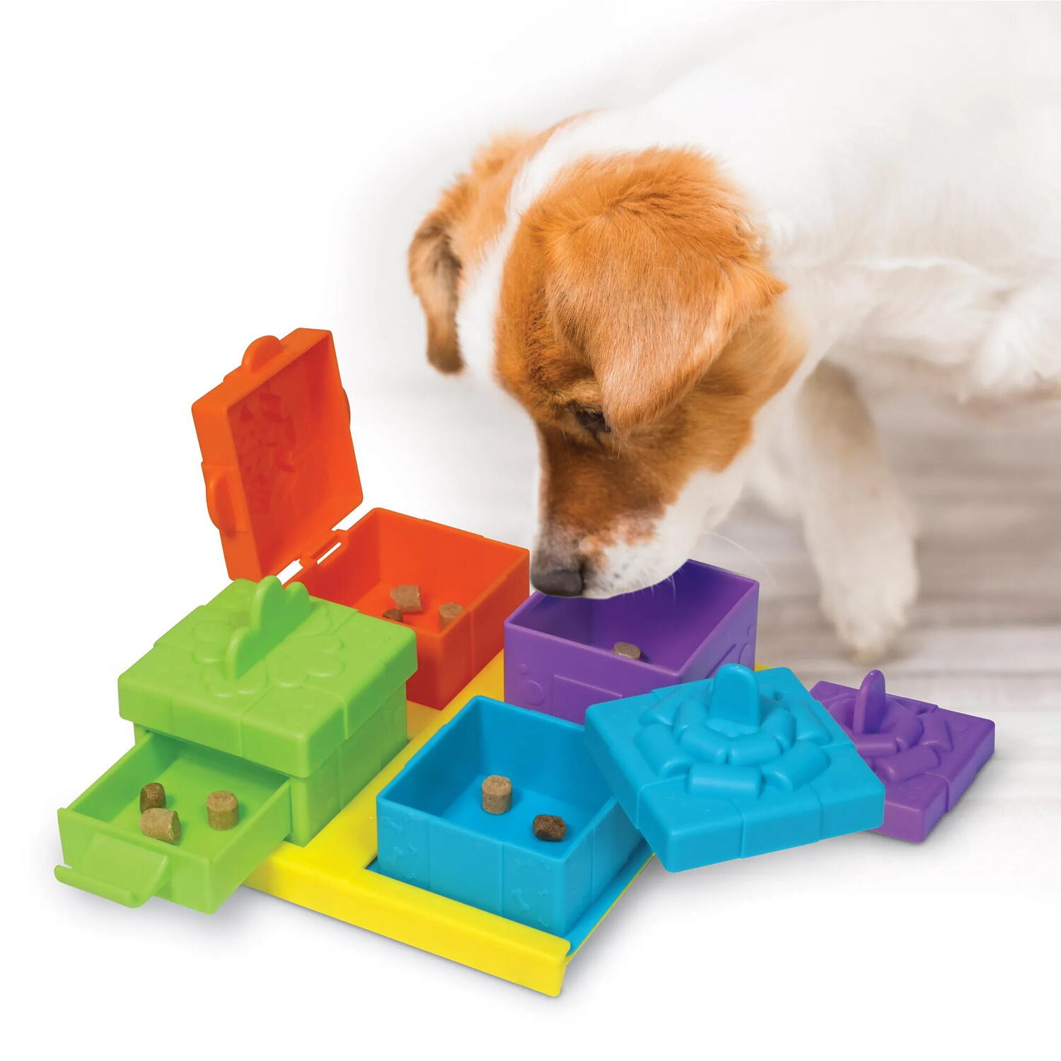 - cainii isi folosesc creierul si labutele pentru a elibera recompensele si a se distra cu aceste cutiute colorate pline de surprize