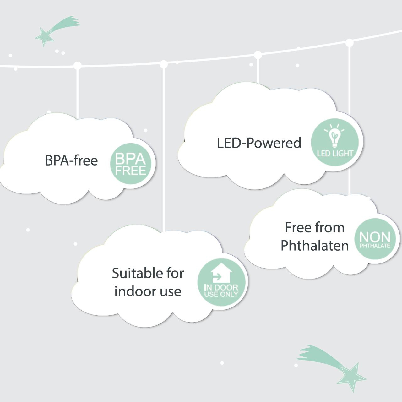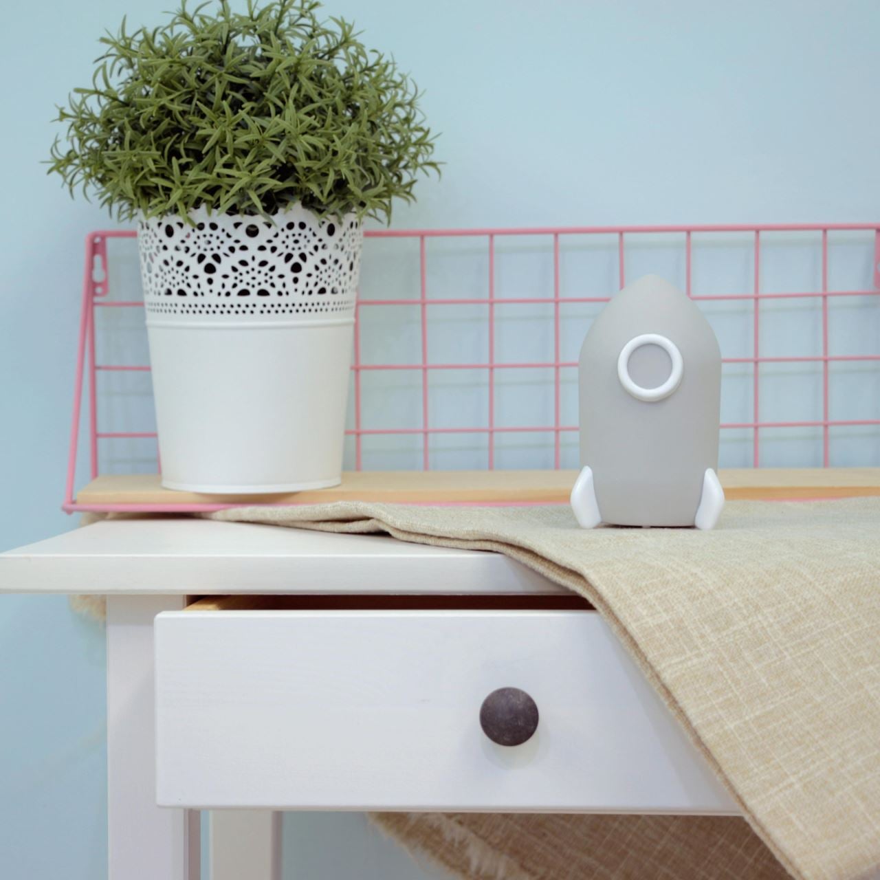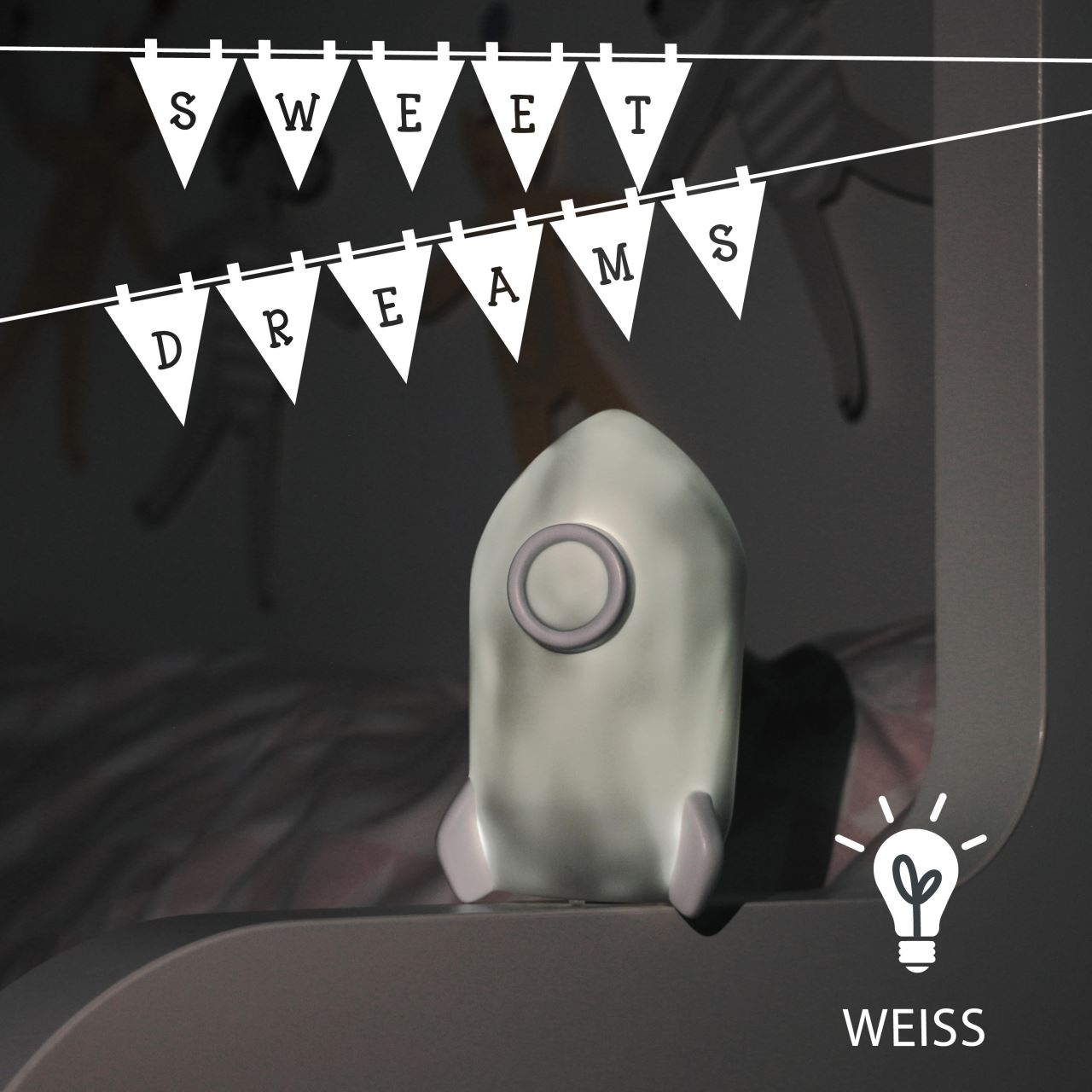 Somn netulburat si odihnitor al bebelusuluiLampa de veghe in forma de racheta gri pentru copii Lumilu Sweet Dreams Rocket este un accesoriu decorativ dragut in camera copiilor, care ii ajuta sa se simta in siguranta atunci cand raman singuri, pe timp de noapte. Copilul adoarme linistit datorita iluminarii slabe. Lampa are oprire automata, datorita functiei de cronometru. Dupa ritualurile de seara (citit, imbratisari, discutii), temporizatorul asigura stingerea automata a luminii dupa 15 minute. Utilizare sigura datorita luminilor LED si detaliilor inteligenteDeosebit de sigura pentru copii datorita compartimentului pentru baterii, cu insurubare. Astfel, copilul nu poate ajunge la baterie. In plus, designul fara margini si materialul nontoxic - fara BPA si ftalati - fac din aceasta lampa de veghe un companion sigur pentru micutii nostri. Utilizarea este cu atat mai sigura si datorita luminilor LED. Lampa de veghe ofera siguranta prin utilizarea tehnologiei moderne LED. Datorita degajarii scazute de caldura, nu exista riscul de aprindere nici macar in cazul utilizarii pe termen lung. In acelasi timp, aceste lumini creeaza o atmosfera placuta, linistitoare si calda.Specificatiile produsuluiLampa de veghe pentru noptiera, cu lumina LEDForma de rachetaDimensiuni: aproximativ 7 x 7,6 x 12 cm Material: plasticTemporizator stingere automata cronometrata dupa 15 de minute, pentru economie de energie si durata prelungita de viataFara risc de incendiu, chiar si in cazul utilizarii pe termen lungDeosebit de sigura pentru copii datorita compartimentului pentru baterii cu insurubareMateriale netoxice, fara poluanti - fara BPA si ftalatiFunctioneaza cu 3 baterii LR44 (nu sunt incluse)Durata de viata a lampilor LED: aproximativ 50000 oreCuloare lumina LED: albClasa de protectie: IP20 (pentru utilizare doar la interior)
