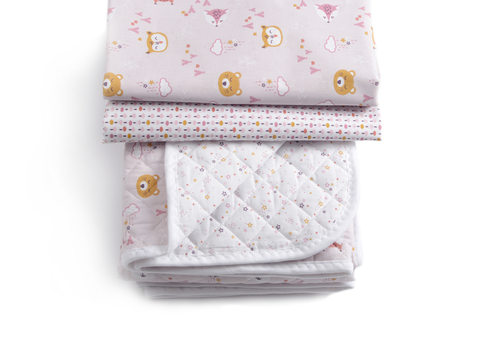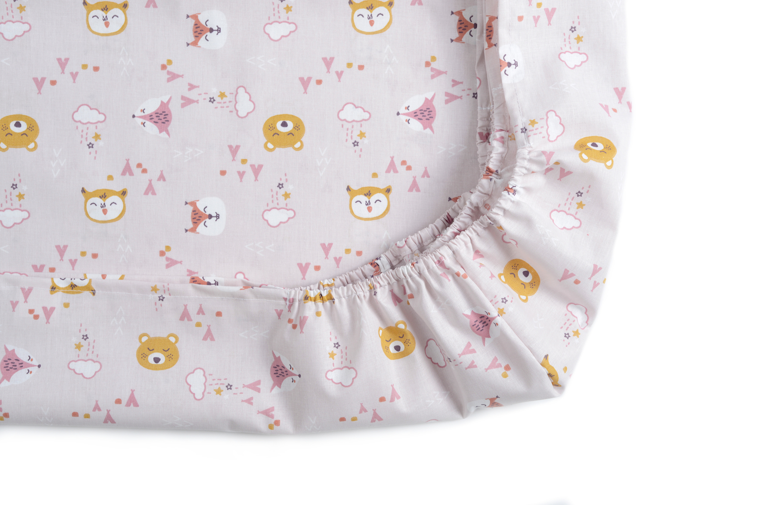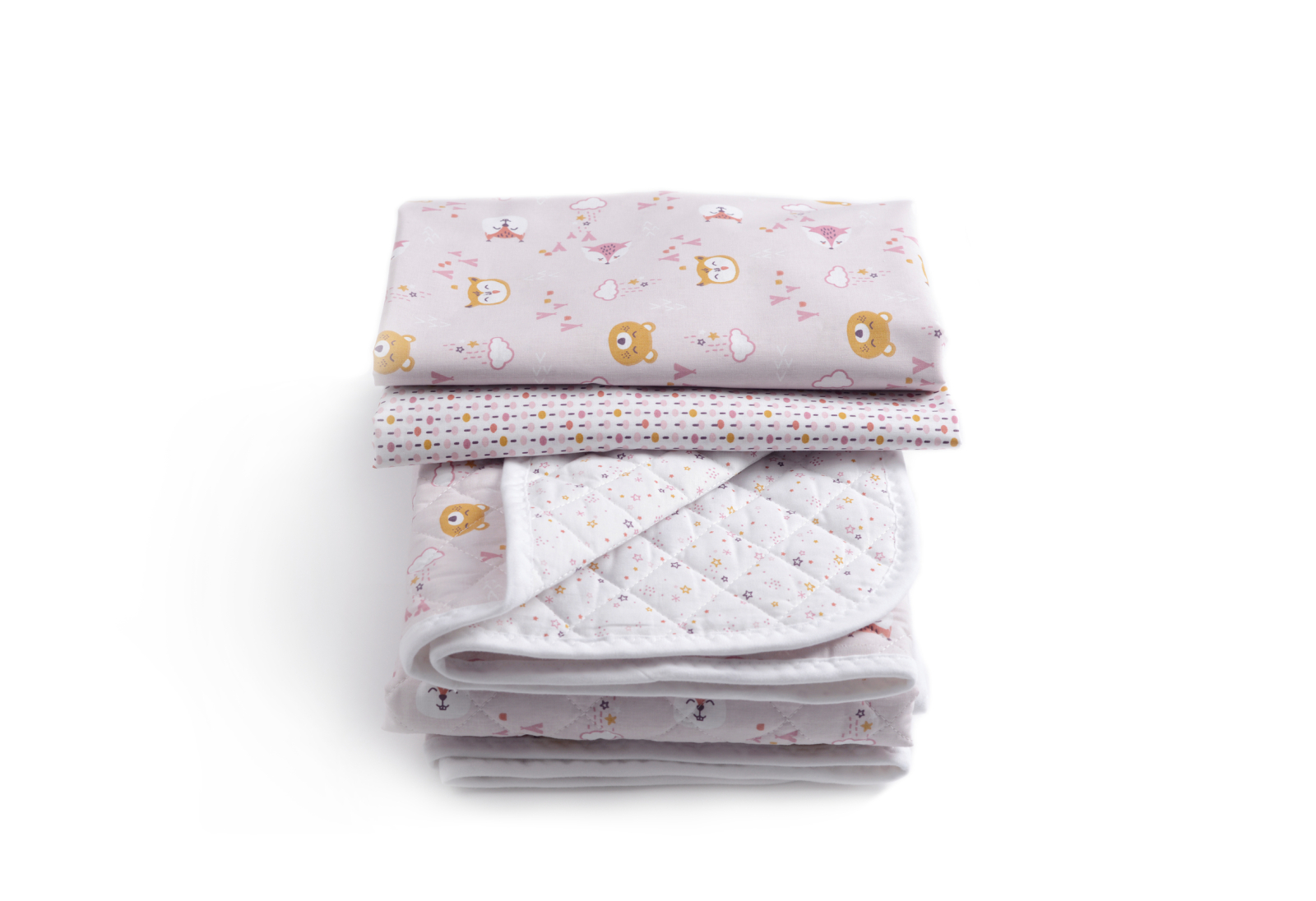 - 2 cearceafuri prevazute cu elastic in colturi, pentru a ajuta la prinderea rapida a cearceafului pe patut si sustinerea intinsa, pentru a nu crea cute sub bebelus.