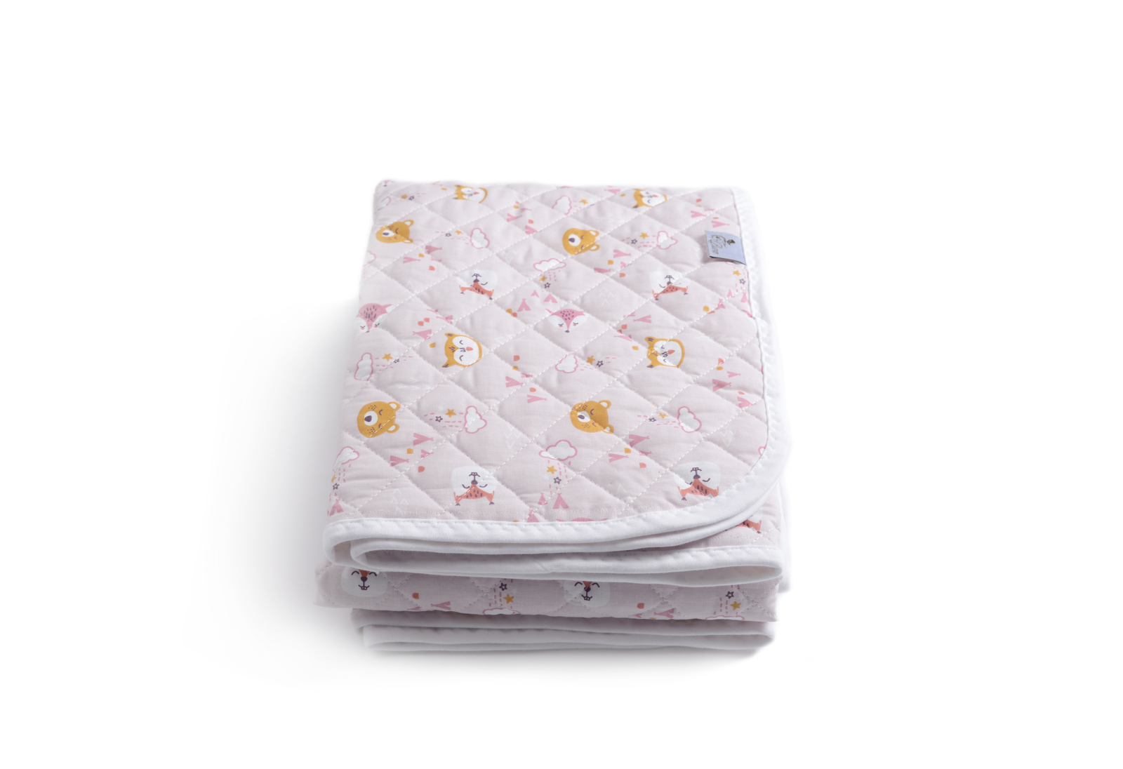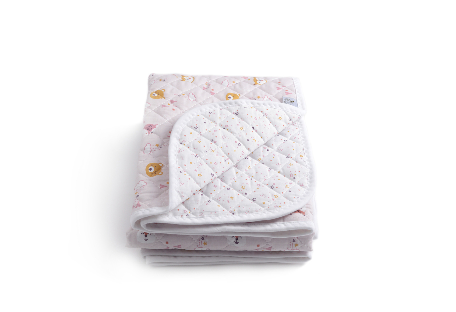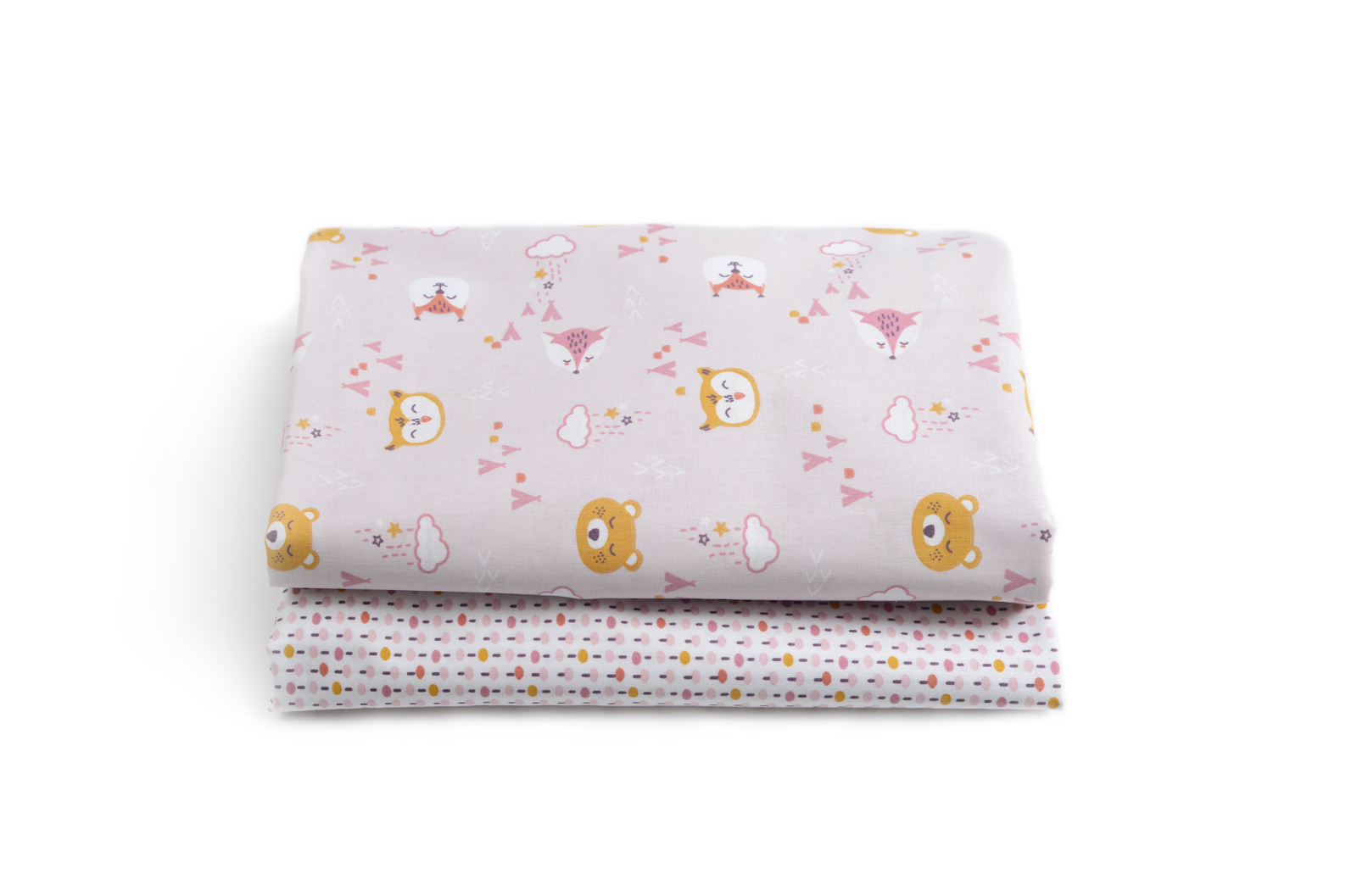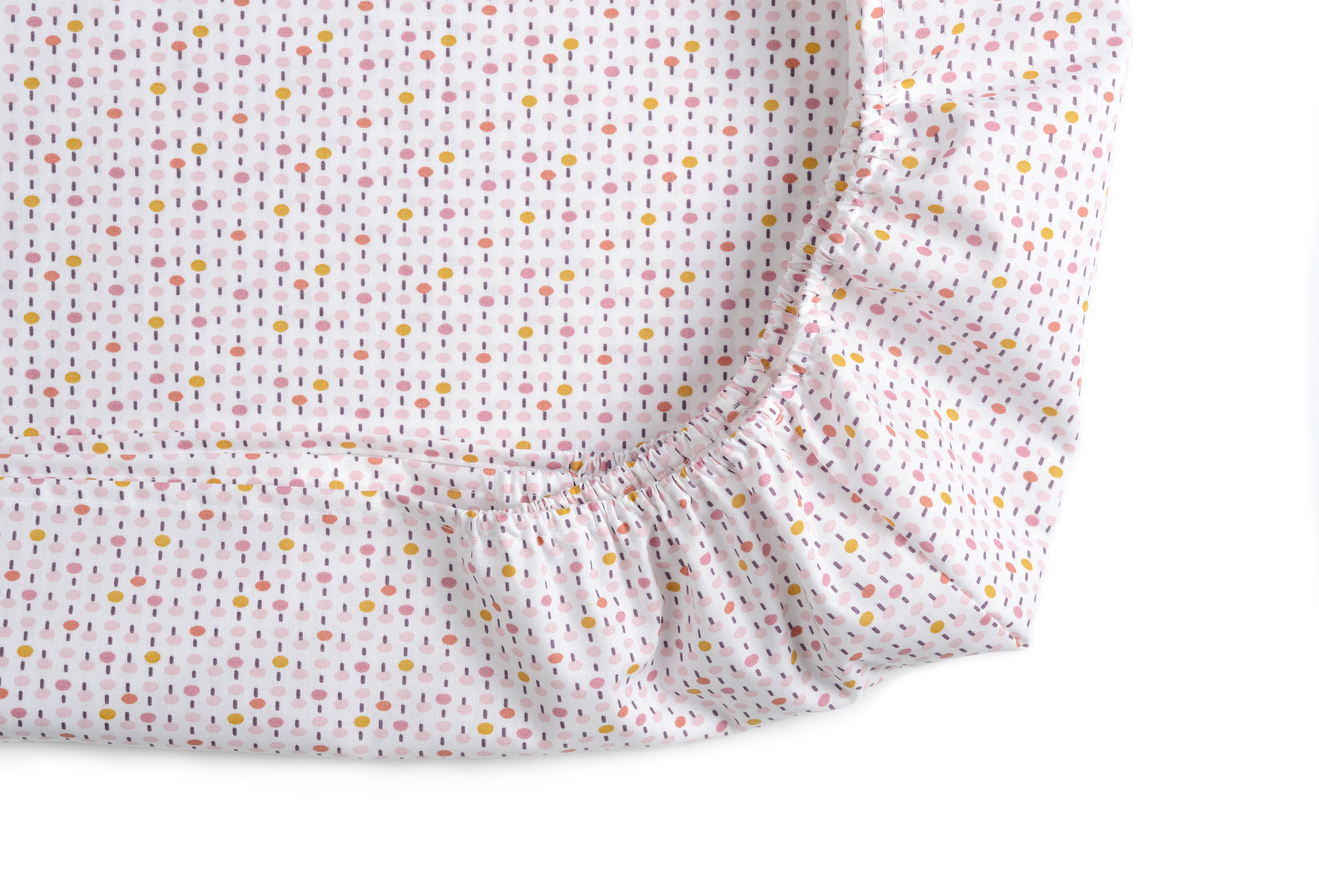 - 2 cearceafuri prevazute cu elastic in colturi, pentru a ajuta la prinderea rapida a cearceafului pe patut si sustinerea intinsa, pentru a nu crea cute sub bebelus.
