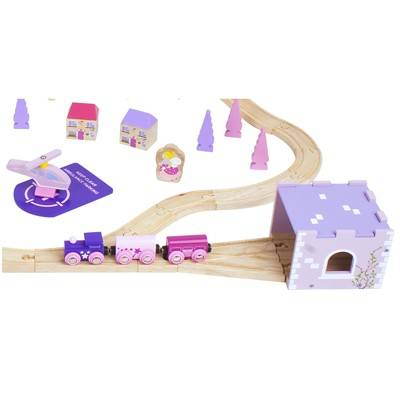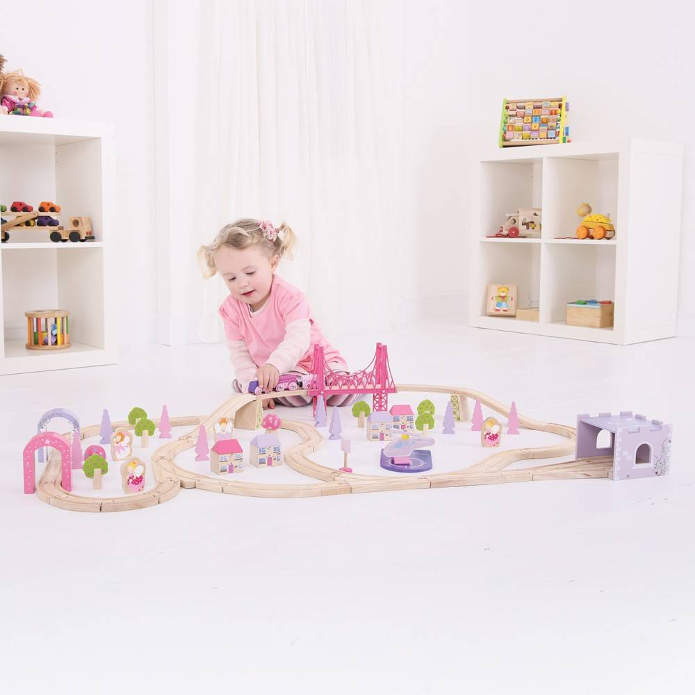Circuitul este alcatuit din 75 piese in culori pastelate (trenulet, casute, copaci, zane, elicopter, etc.)Pentru extinderea acestuia si automat mai multa distractie, setul poate fi imbogatit cu elemente suplimentare provenind de la alte jocuri similare.Material: lemnVarsta: +3 aniDimensiune: 114 x 70 cm