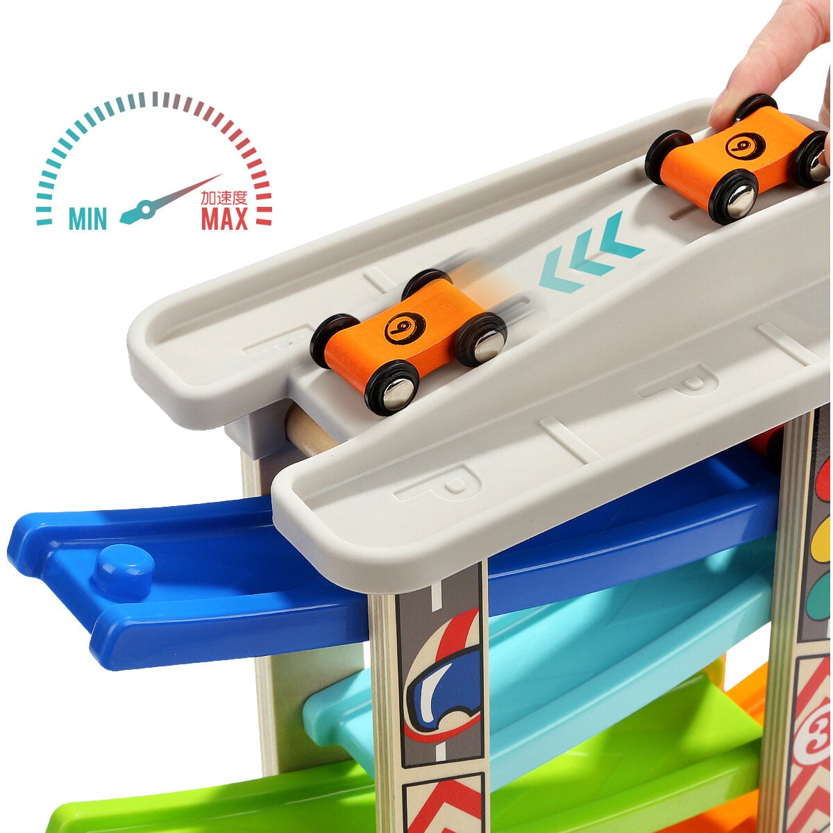 Pe locuri, fiti gata, START!Aceste masinute de curse se deplaseaza in jos pe rampa cu o viteza uluitoare si efectueaza salturi de la un nivel la altul.