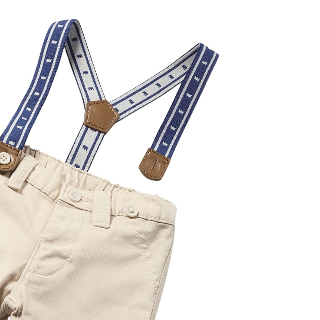 Pantaloni cu bretele Better Cotton nou-nascut - MayoralPantalonii lungi cu bretele are talie reglabila, iar inchiderea cu un nasture din material moale din bumbac elastic.Tesatura este confortabila si foarte rezistenta.Pantalonii vin cu bretele detasabile si au buzunare frontale decorative. Acesti pantaloni au o nuanta speciala, care face ca finisajul sa nu fie uniform sau culoarea poate varia in functie de spalarile efectuate. Bretele asortate incluase. Material: Exterior
