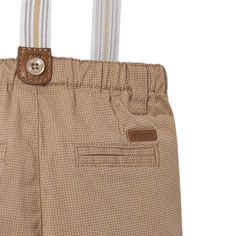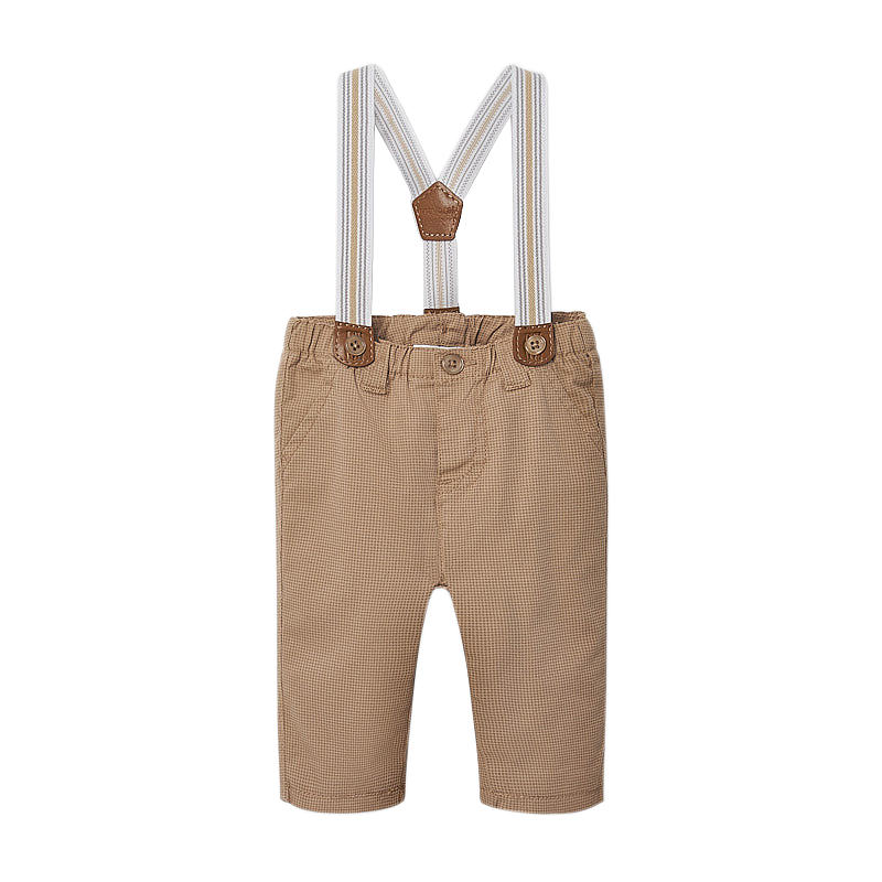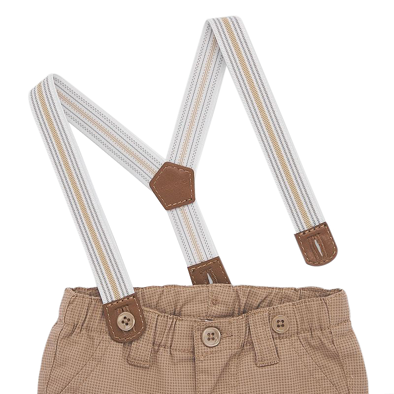 Pantaloni lungi cu bretele Pantaloni lungi pentru baiati, cu talie reglabila pentru ajustarea marimi si inchidere cu nasture, gaici pe talie si slit fals.Bretele se prind cu nasturi pe betelia pantalonului si pot fi detasabile.Tesatura confortabil, foarte rezistenta. Marimile mai mici ale acestui model de pantaloni, au o deschidere suplimentara intre picioare, cu inchidere prin capse, pentru a usura imbracarea bebelusului.Material: exterior - 97% bumbac / 7% elastan captuseala - 100% bumbac bretele - 70% poliester / 30% elastodienaCuloare: hazelnut (aluna)Intretinere: Spalare: automata / manuala, cu detergent pentru rufe delicate