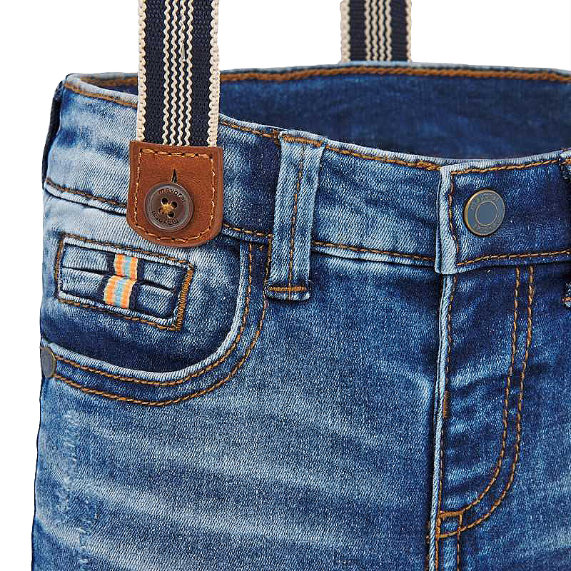 Pantaloni lungi -Denim cu bretelePantaloni pentru bebelusi, largi in partea superioara, cu ajustare normala pe coapsa si elastici pe picior. Acestia sunt cu talie inalta si usor cazuti, ideali pentru un look casual si modern. Pantalonul se inchide prin capsa pe partea frontala, iar talia este reglabila pentru ajustarea marimii. Buzunarele sunt functionale pe partea din fata, cat si la spate.Acest material din denim are efect de spalare si finisare de uzura.In plus pantalonii vin impreuna cu bretele detasabile. Material: pantaloni - 71% bumbac / 22% poliester / 6% viscoza / 1% elastan bretele - 70% poliester / 30% elastodienaCuloare: albastru prespalat