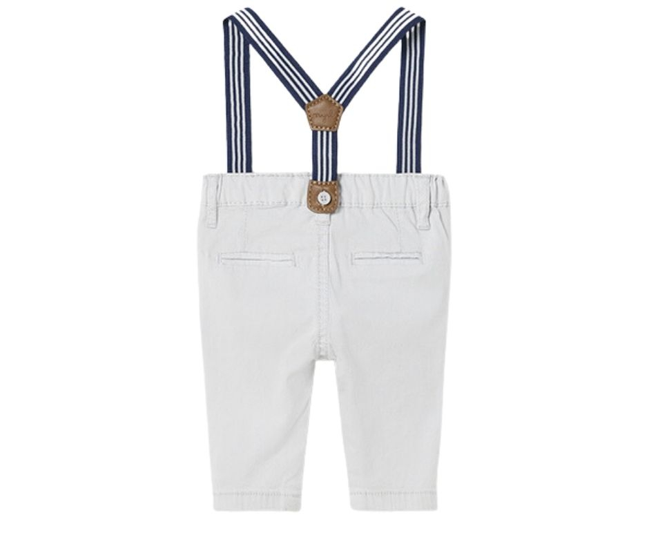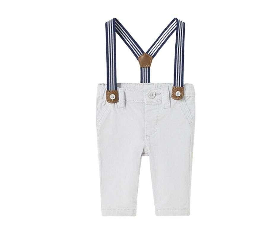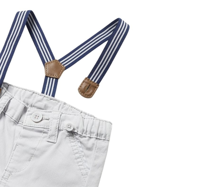 Pantaloni lungi cu bretele bejPantalonii lungi cu bretele are talie reglabila, iar inchiderea cu un nasture din material ECOFRIENDS ce contine bumbac sustenabil.Tesatura este confortabila si foarte rezistenta.Pantalonii vin cu bretele detasabile si au buzunare frontale decorative. Acesti pantaloni au o nuanta speciala, care face ca finisajul sa nu fie uniform sau culoarea poate varia in functie de spalarile efectuate. Bretele asortate incluase. Material: pantaloni - exterior - 98% bumbac / 2% elastan bretele - 70% poliester / 30% elastodienaCuloare: pantaloni: gri bretele: bleumarin