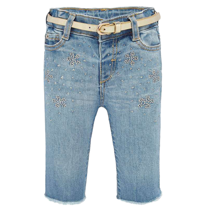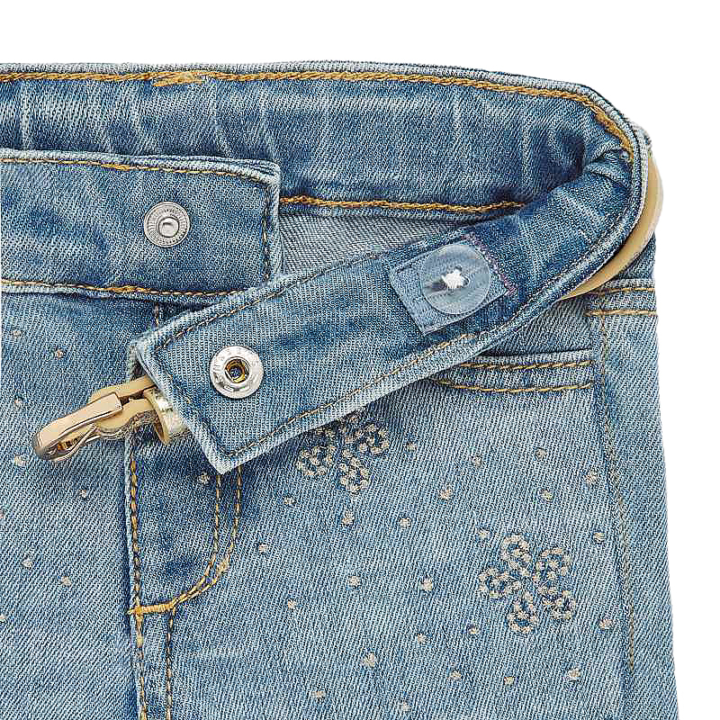 Pantaloni regular - Denim, fetita Pantalonii pentru fetita sunt evazati, cu inchidere prin capsa pe partea frontala. Talia este reglabila pentru ajustarea marimi. Materialul are efect de spalare si finisare de uzura. Designul cu tiv franjurat, cureaua este detasabila in talie, iar buzunarele sunt functionale pe partea frontala si posterioara. Elemente decorative: broderii pe partea frontala.Material: pantaloni - 92% bumbac / 6% poliester / 2% elastan curea - 100% poliuretanCuloare: pantaloni - albastru curea - bejIntretinere: Spalare: automata / manuala, cu detergent pentru rufe delicate