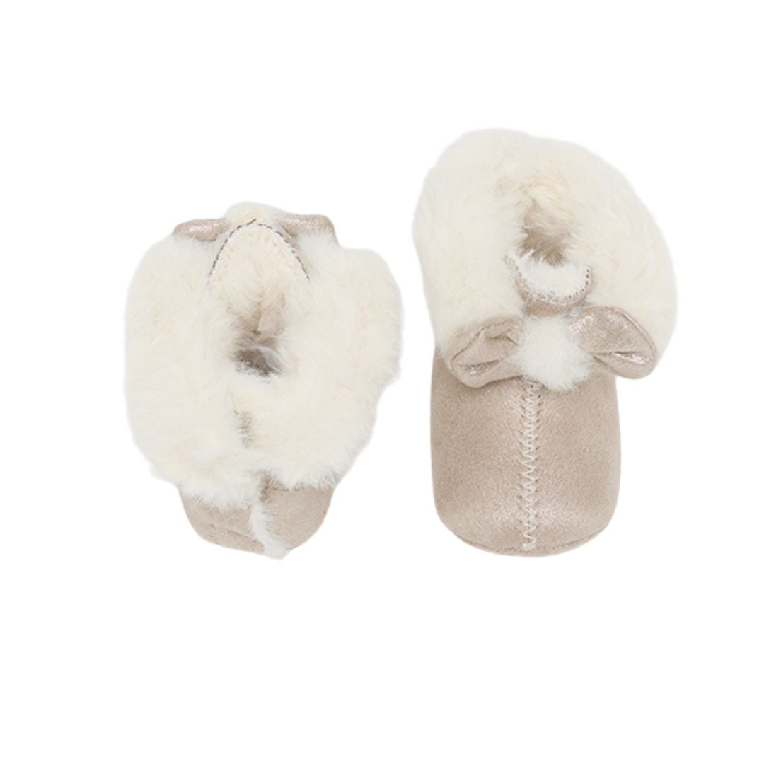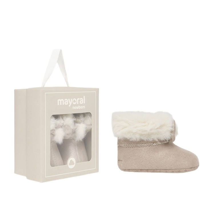 Ghete blanita - Bej sidef - Mayoral Articolul se prezinta intr-o cutie din linia Newborn, fiind ideala pentru cadou.Cizme medii, pentru bebelusi, foarte practice pentru protejarea picioarelor in zilele friguroase. Talpa lejera si antiderapanta.Elemente decorative: fundita si ciucure.