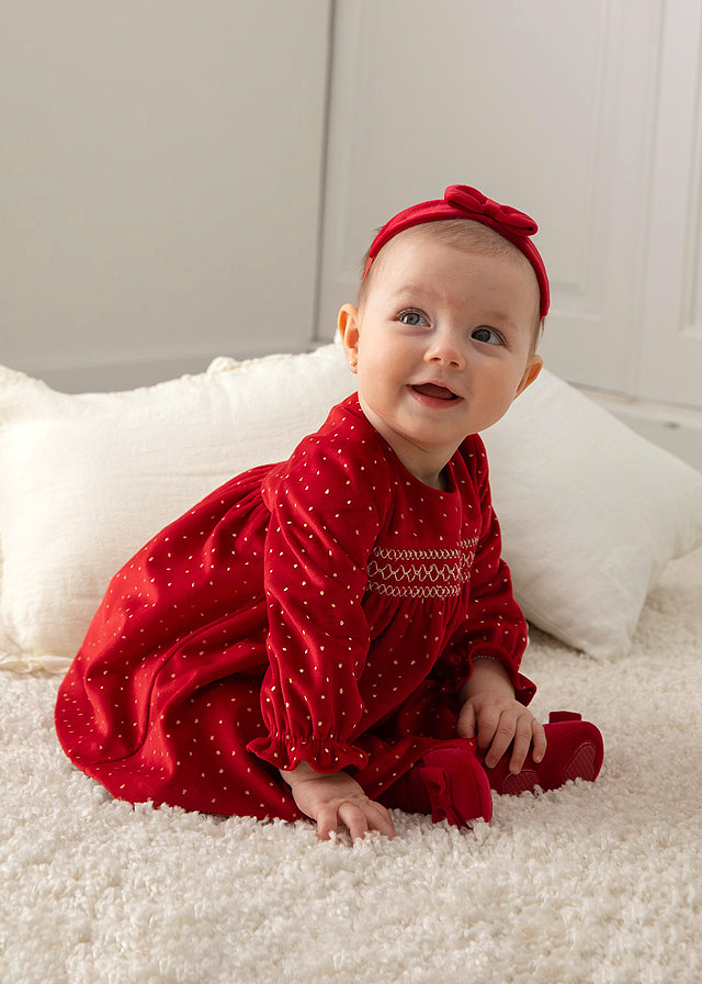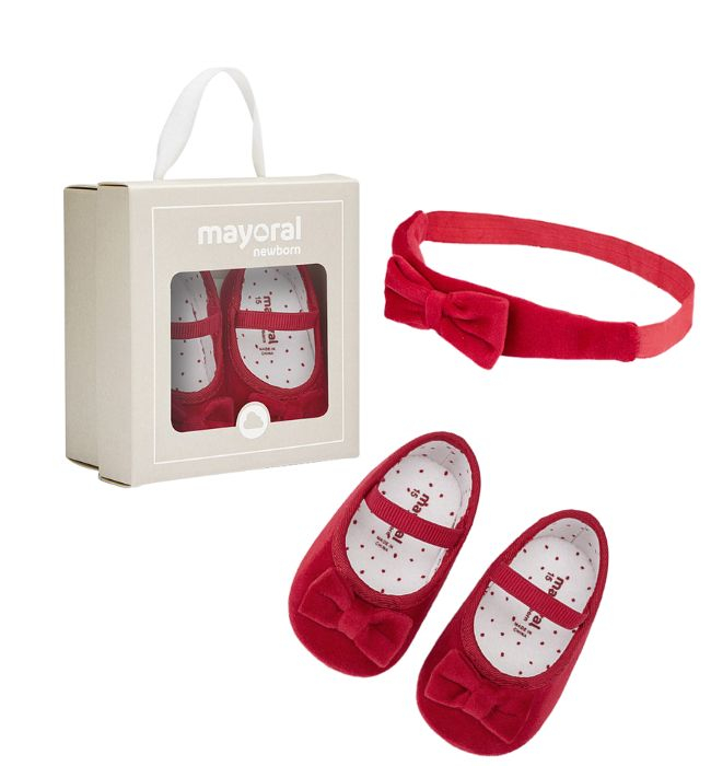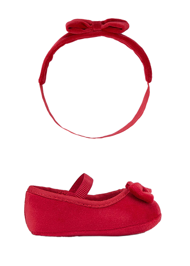 Un set elegant si rafinat, perfect pentru micutele care vor sa straluceasca la evenimente speciale sau in momentele importante. Pantofii tip balerini, realizati din catifea fina, au un design clasic si atemporal, completat de o fundita delicata ce adauga un plus de feminitate.
