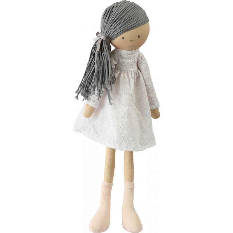Papusa MeganPapusa Megan este subtirica si eleganta, imbracata in hainute din materiale naturale, placute la atingere si in mod cert sigure pentru bebelusul tau. Are o rochita din panza alba de bumbac cu broderie fina florala , cizmulite asortate si par saten prins intr-o parte.