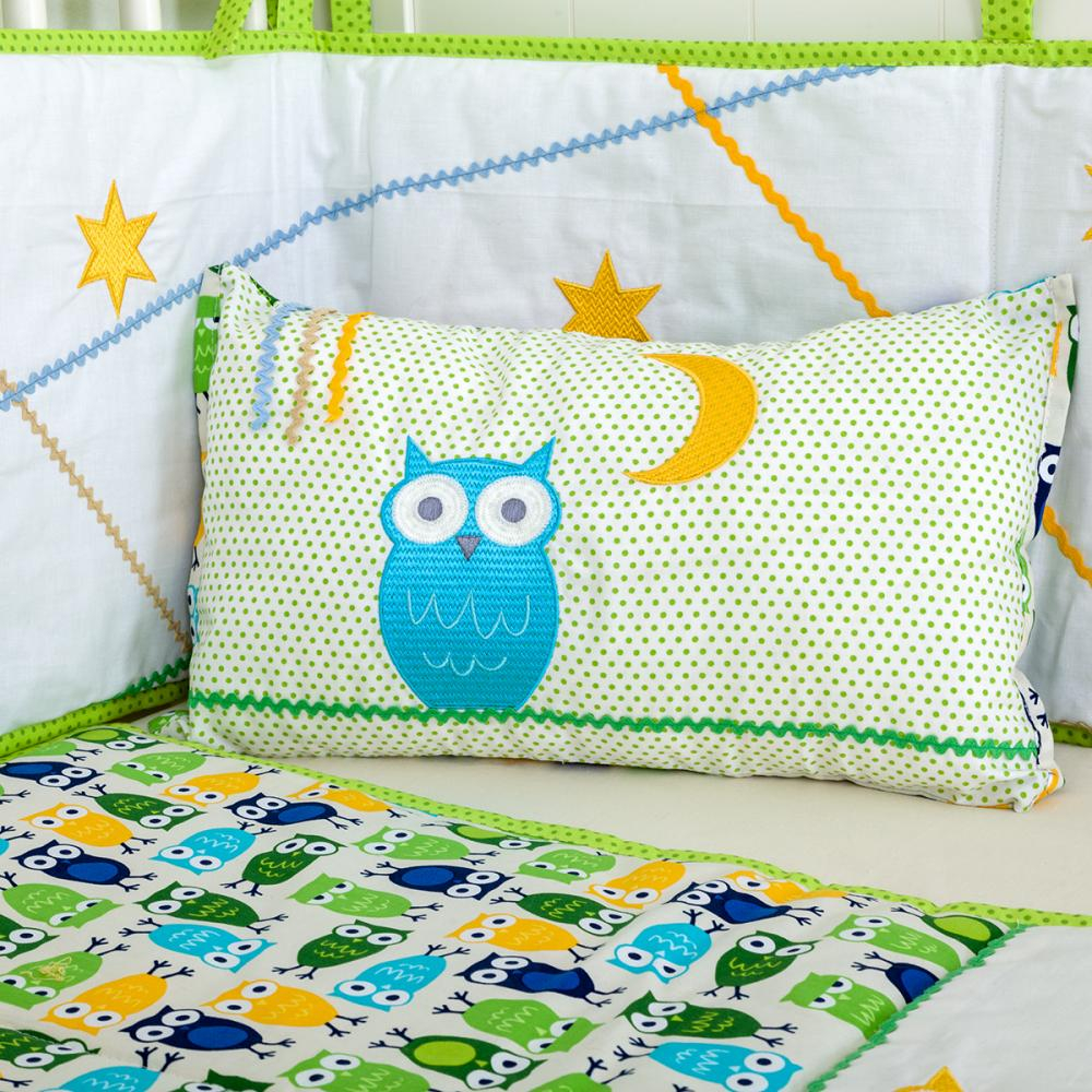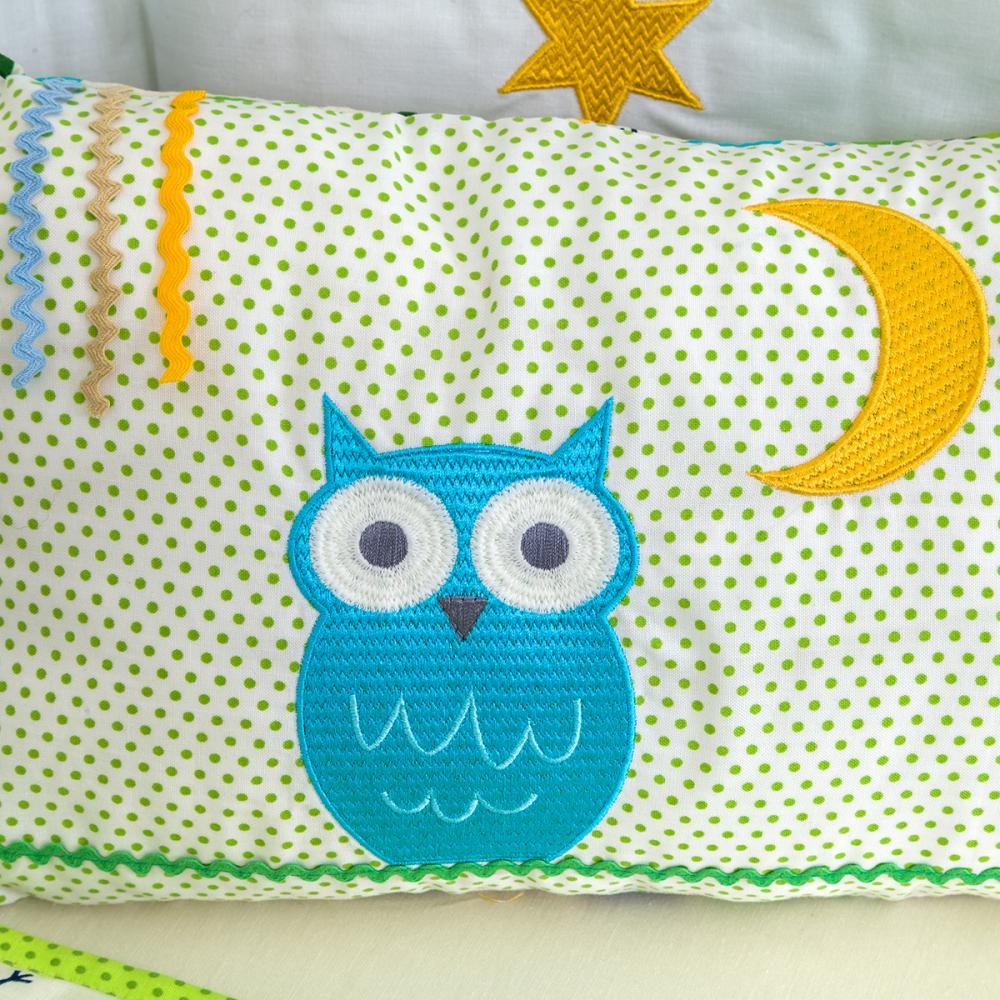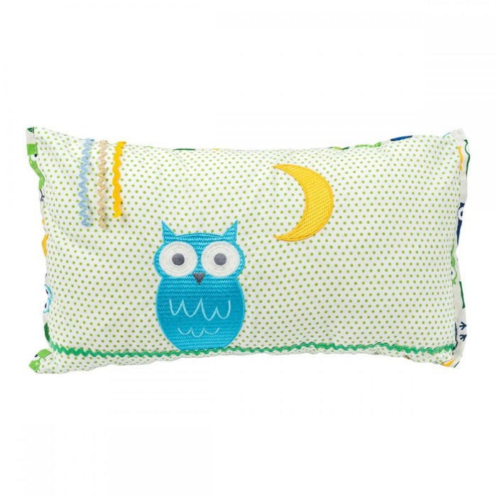 Fata pernei este din panza alba cu buline verzi si brodata o bufnita curioasa, iar spatele are imprimeu cu bufnite colorate.