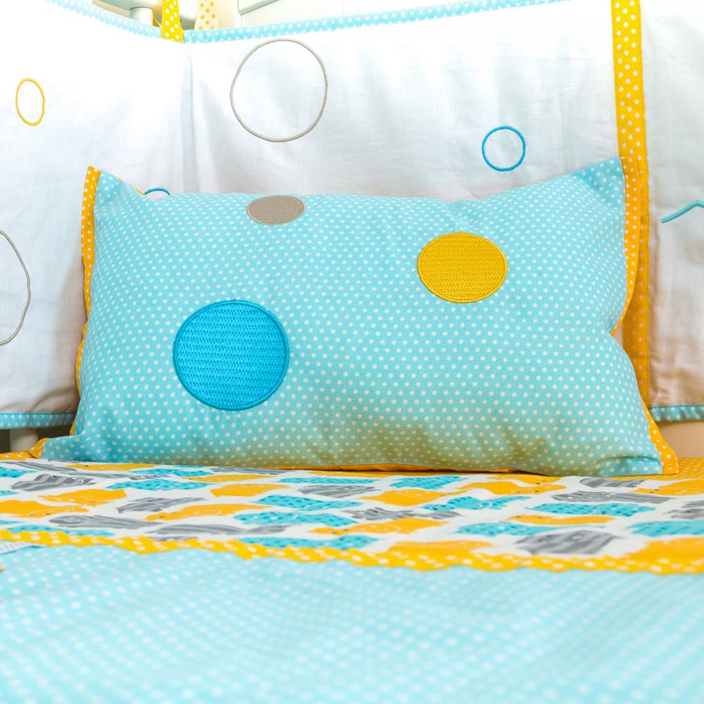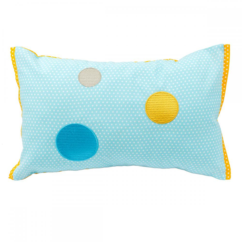 Fata pernei este din panza portocalie cu buline albe, iar spatele, albastru cu buline albe si brodate 3 cercuri colorate.Face parte din Colectia Hipopotami, dar poate fi achizitionata si separat.Material: 100% bumbac - exterior