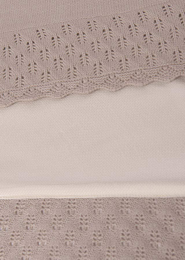 In interior este captusit cu blana fina si moale. Material tricotat fin, avand decoratie dantela (motive ajurate).