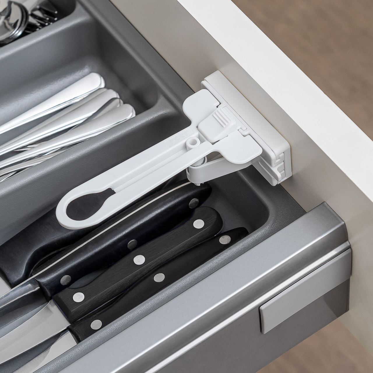 Un sertar prevazut cu sigurante poate fi deschis doar cat o mica crapatura si imediat tija sigurantei se cupleaza in pozitia de blocare. Copilul este impiedicat sa aiba acces la continutul sertarului si nu risca sa isi blocheze sau sa isi ciupeasca degetele atunci cand ar incearca sa inchida sertarul. Sertarul poate fi deschis sau inchis complet numai atunci cand un adult desface dispozitivul de siguranta. Mecanismul dublu de deblocare al sigurantei mentine, sertarele dumneavoastra inchise în siguranta de micii exploratori. Este insa usor pentru adulti sa deschida cu o singura mana. Pentru a face acest lucru, glisati cursorul inainte si apasati in jos - apoi sertarul se deschide ca de obicei.Utilizare universala datorita designului inteligent. Sigurantele pentru sertare pot fi utilizate in siguranta cu suprafete de lucru mai groase, (pana la 20 mm) si in sertare care nu sunt foarte adanci. Acest lucru ii permite sa ofere protectie maxima impotriva tuturor articolelor periculoase din sertarele de bucatarie.Sigurantele se moteaza in interiorul sertarului si sunt invizibile din exterior in timpul utilizarii, ceea ce inseamna si ca nu sunt lasate daune inestetice pe fronturile vizibile ale usilor, dupa utilizare. Ele pot fi montate cu benzi adezive sau cu suruburi, atasare extrem de usoara datorita ajutorului de montare livrat in pachet. Sigurantele sunt supuse atat testelor interne stricte ale producatorului Reer din Germania, cat si examinarii de catre institutii externe, trecand cu succes standardul de siguranta EN 16948:2017 (pentru dispozitive de siguranta pentru dulapuri si sertare) in ceea ce priveste prinderea, durabilitatea si rezistenta. Chiar si dupa mai mult de 5.000 de deschideri, acesta ramane stabil si garanteaza aceeasi protectie ca atunci cand e nou.Specificatiile produsuluiblocheaza sertarele si ofera protectie copiilor, previne blocarea sau ciupirea degetelormechanism cu dubla blocare pentru un plus de sigurantaideal pentru sertare putin inalte, de ex. cu tavi pentru tacamuri sau blaturi de maxim 20 mmtestat conform normei de siguranta EN 16948:2017este posibila montarea cu banda adeziva sau suruburi (incluse in pachet)setul include material de montaj si ajutor de instalareoperare simpla cu o singura mana pentru adultirezista minim la 5000 de uzaricontinut pachet: 2 sigurante, inclusiv benzi adezive si suruburi de montaj