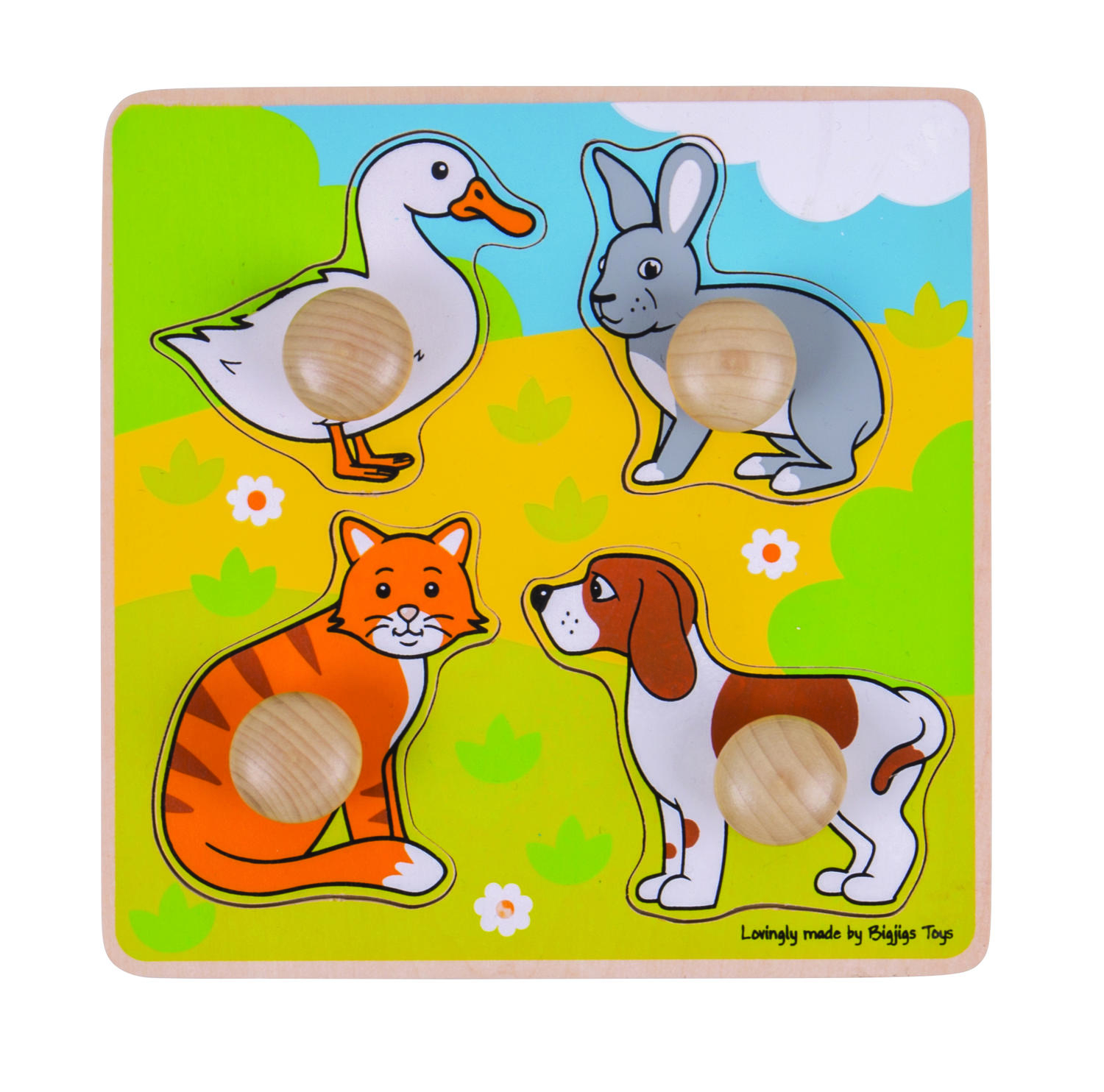 Setul cuprinde: - 4 piese cu animale Piesele au cate un maner rotund din lemn, special dimensionat pentru mainile mici ale copilului.Acesta, dezvolta abilitati kinestezice si de potrivire, vocabularul, dexteritatea, concentrareaPuzzle-ul este in conformitate cu standardele Europene curente de siguranta.Material: lemnVarsta: +12 luni