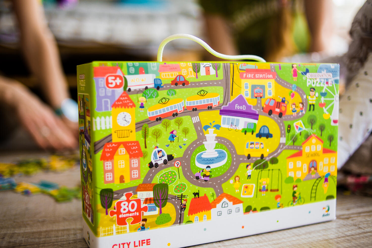 O zi insorita este intotdeauna potrivita pentru o plimbare prin oras. Asambleaza cele 80 de piese pentru a completa perfect traseul cu stradutele, parcurile si cladirile sale.Dupa ce ai terminat, transforma totul intr-un joc pe cinste incercand sa identifici cat mai repede unde sunt ascunse in oras toate elementele marcate pe rama puzzle-ului.